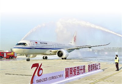 昨天16时01分,随着国航C919重飞“两航起义”航线主题航班平稳降落在天津滨海机场,并接受民航界最高礼遇“过水门”,该航班顺利完成香港—天津的飞行任务,在“两航起义”纪念日重飞76年前“两航起义”的北飞航线,重温光辉历史记忆。