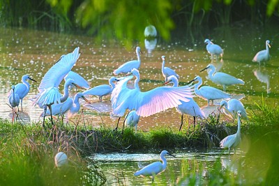 白鹭在重庆市梁平区双桂湖国家湿地公园内嬉戏。新华社发