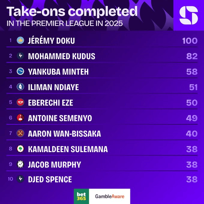 多库成为了第一位在2025自然年英超完成100次过人的球员。