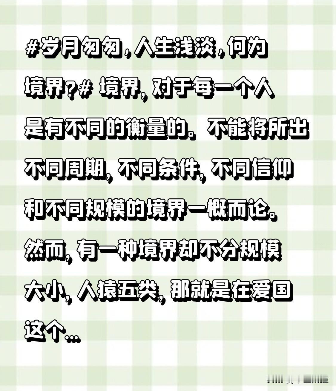 境界,于每个人而言,衡量标准各异。不能将处于不同时期、不同环境、不同信仰和不同层次的境界相提并论。 然而,有一种境界,无关规模大小、人等高低,那便是爱国的境界。在保家卫国的现实面前,爱国的境界并非体现在规模上,而是体现在内心深处高度的责任感以及真挚的爱国情感! 灵魂的至高境界 境界的含义