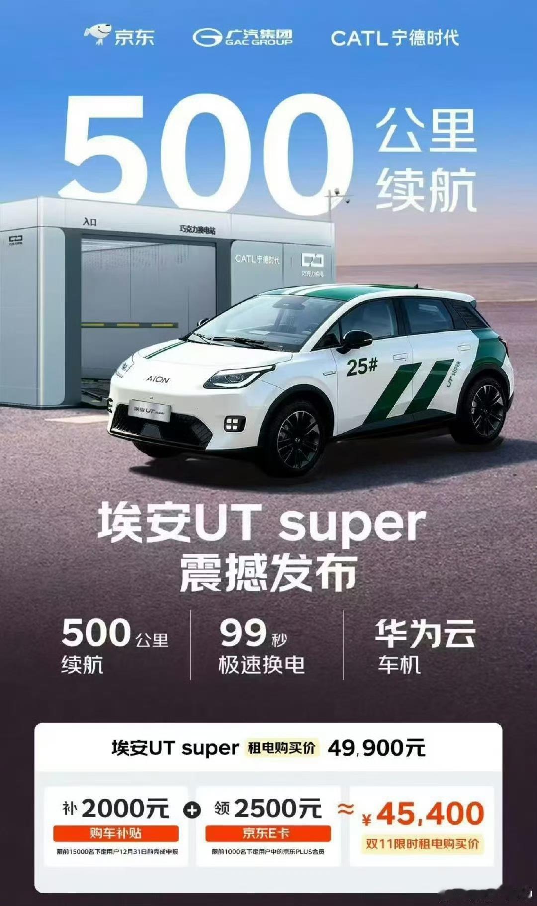 孙少军:广汽埃安UT super正式上市,电池租用方案售价4.99万元,整车购买方案8.99万元! 这说明蔚来的商业模式还在不断被认可,电池和车分开,对于企业来说,电池也是其核心资产的一部分,对用户来说可以显著降低购买的成本。 电池租赁还有个好处,不用担心自己的电池衰减,因为电池本身就不是自己的,坏不坏和自己没有关系。 各位是怎么看的?欢迎评论区留言。