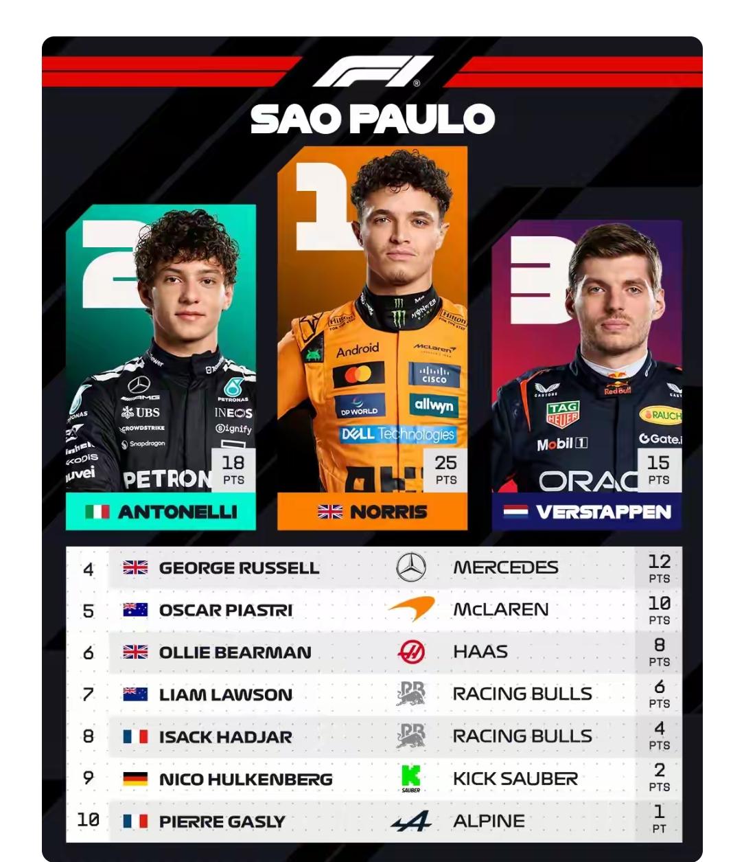 很开心,看到F.1的丑潘距离年终总冠军渐行渐远,都值得我开一瓶香槟庆祝。 我并非不喜欢丑潘,单纯的是不喜欢一个人长期夺冠,丑潘如此,6连冠的汉黑如此,4连冠的瓦子如此,5连冠的舒马赫也如此。 所以,对于迈凯伦的两位车手,无论是诺里斯还是皮亚斯特里夺冠,我都举双手欢迎。 目前还剩下3站,理论上丑潘全部夺冠,迈凯伦全部退赛,红牛还有获胜的可能,只不过这种几率比地球毁灭还要小。 剩下的两站卡塔尔站和阿布扎比站都是迈凯伦的优势,获胜概率很大。 另外一站是拉斯维加斯,是街道赛,红牛和迈凯伦都没有明显优势。 目前诺里斯领先丑潘49分 皮亚斯特里领先丑潘25分。 迈凯伦的年度车手总冠军已经在口袋里了。 这将是迈凯伦车队自从2008年以来的第一个车手总冠军。