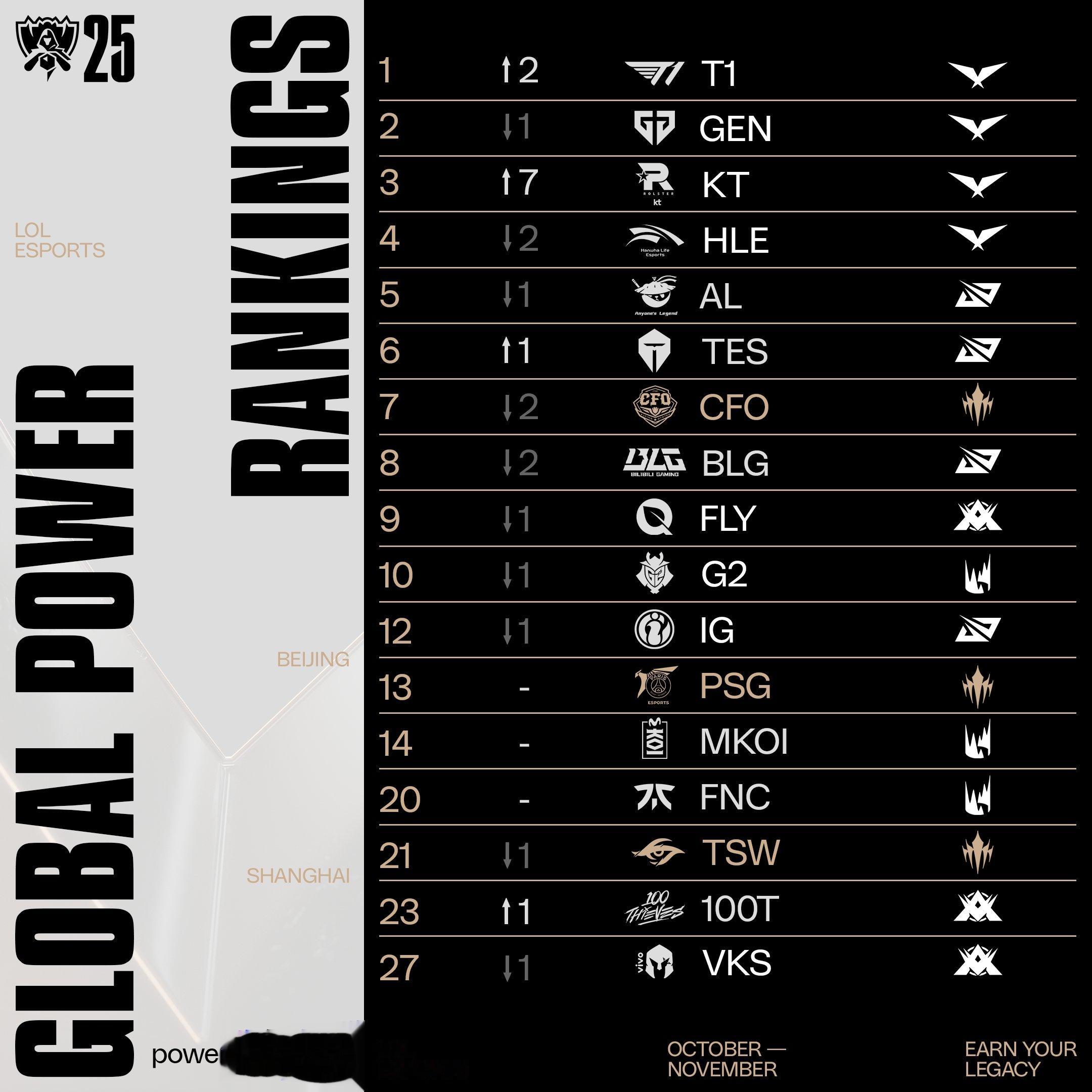 赛事官方公布全球战队实力排行榜:T1第一,LCK包揽前四
