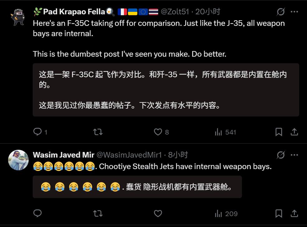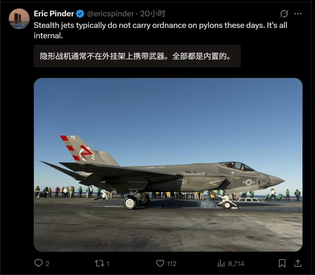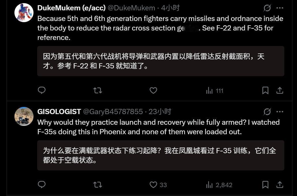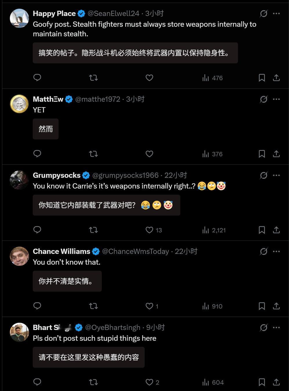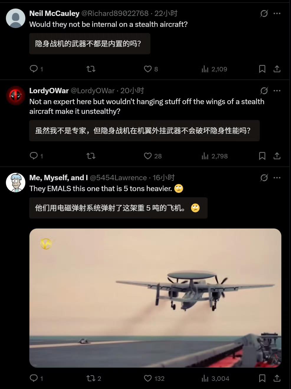 网友分享:美国酸鸡问,“为什么歼-35翼下没有挂载武器和副油箱?很显然是因为发动机和航母弹射器不达标。” 惨遭全世界各国网友嘲笑。 其实海外互联网和国内互联网有着非常相似的地方,很多人都不知道为什么要发展隐身战机,为什么隐身战机外面不挂载导弹。 其实放在全球来说,对这种知识了解比较全面的人比例还是比较少的,但是这个是一个常识性的问题,只需要稍微了解一下就知道了。 各位是怎么看的?欢迎评论区留言。