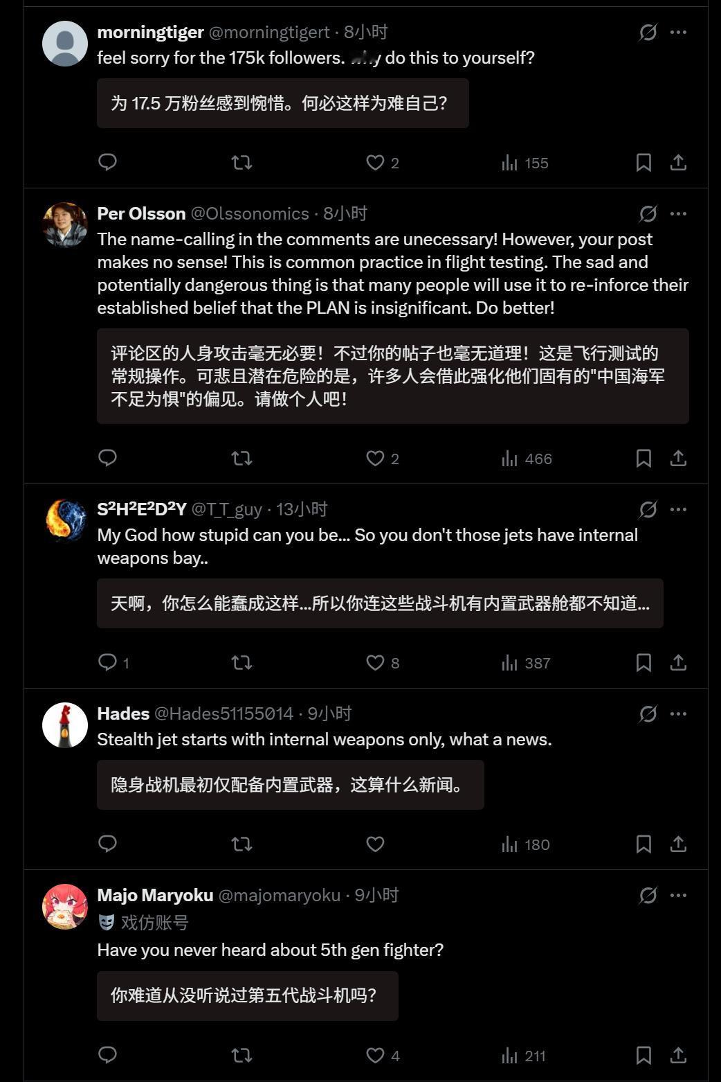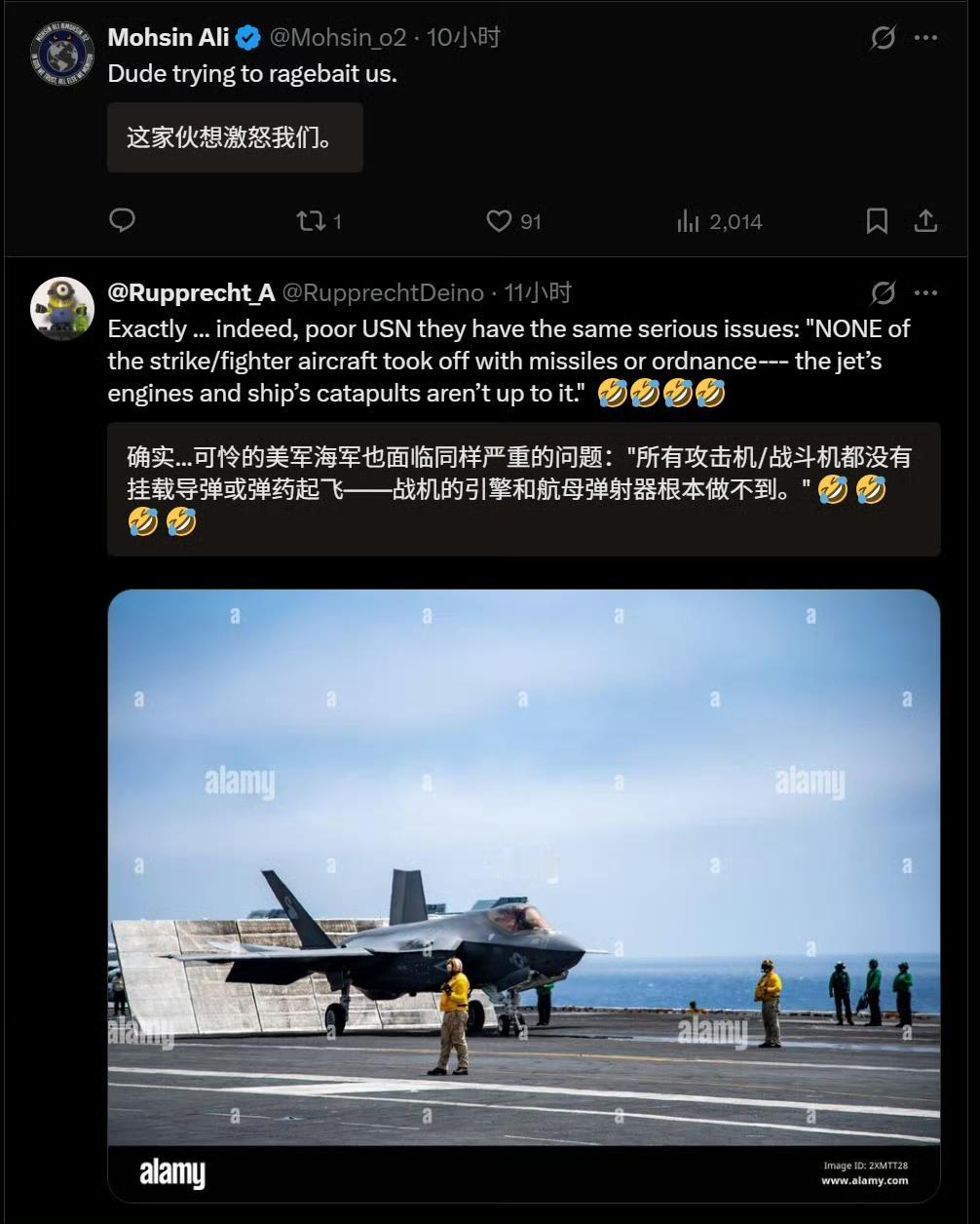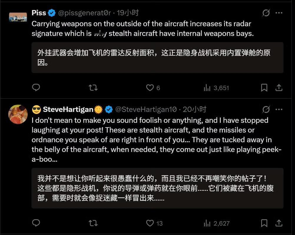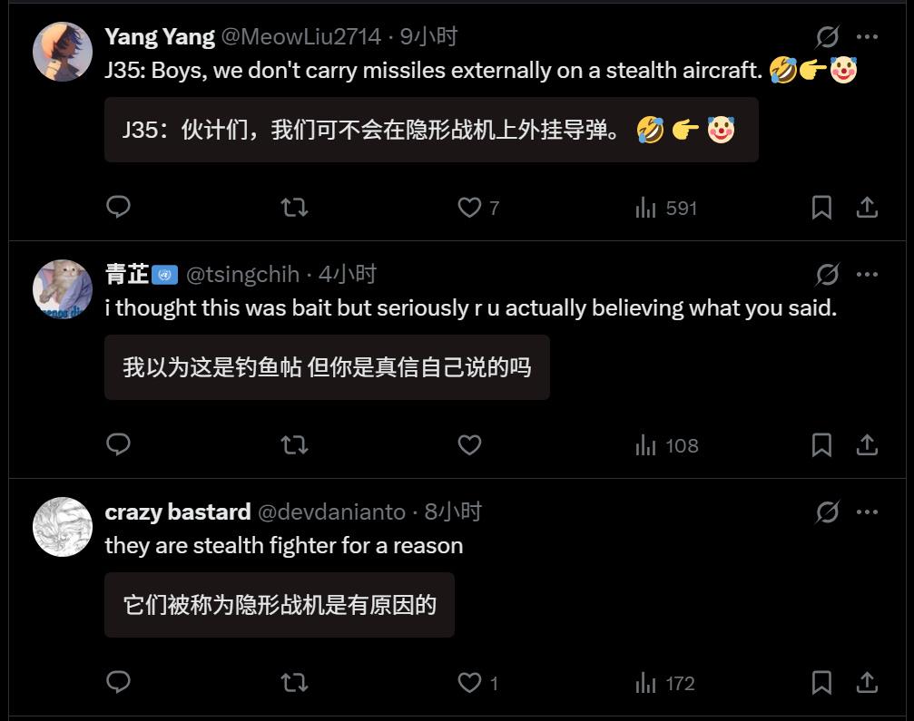 网友分享:美国酸鸡问,“为什么歼-35翼下没有挂载武器和副油箱?很显然是因为发动机和航母弹射器不达标。” 惨遭全世界各国网友嘲笑。 其实海外互联网和国内互联网有着非常相似的地方,很多人都不知道为什么要发展隐身战机,为什么隐身战机外面不挂载导弹。 其实放在全球来说,对这种知识了解比较全面的人比例还是比较少的,但是这个是一个常识性的问题,只需要稍微了解一下就知道了。 各位是怎么看的?欢迎评论区留言。