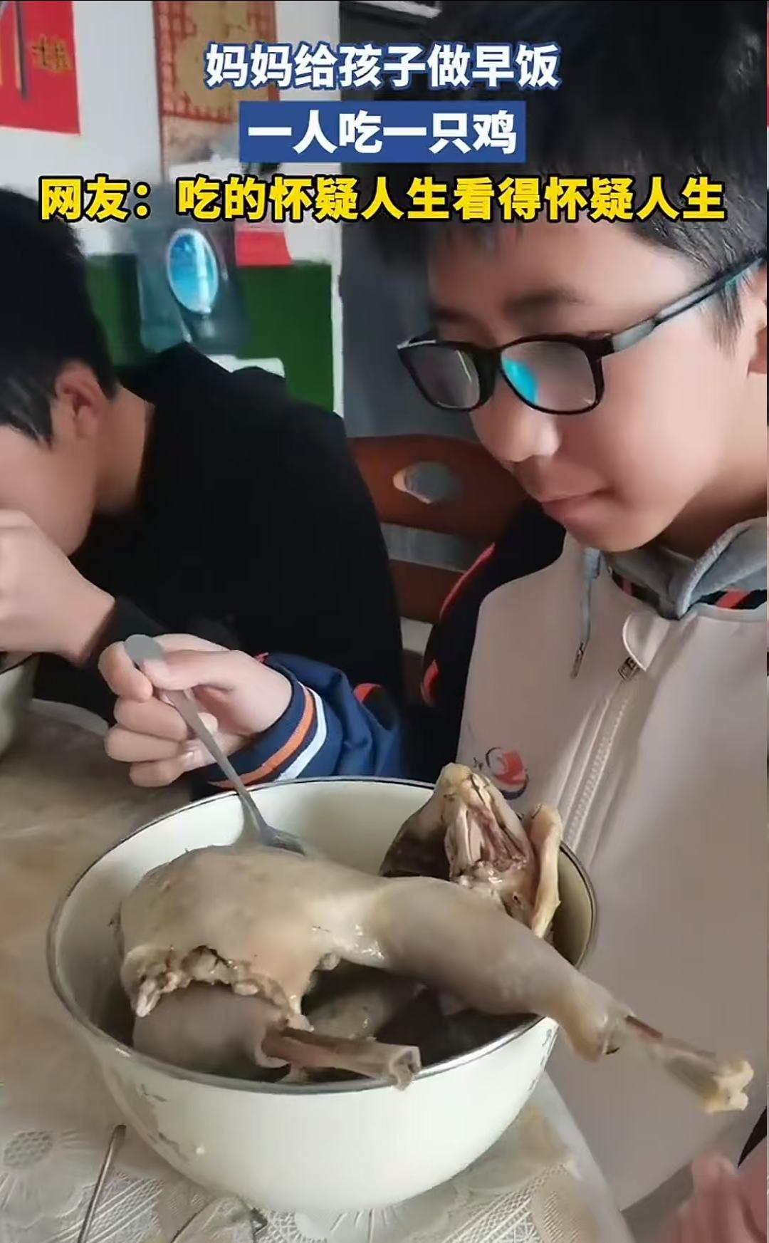 小哥俩起床看到早餐,把俩人一下子干蒙圈了!餐桌上两个大汤盆里面,分别放着一只炖好的鸡。由于鸡子太大个儿,鸡腿还耷拉到盆沿上了。 这是妈妈早早起床忙碌的结果,吃吧,太油腻了;不吃吧,有驳妈妈的心意。 旁边的弟弟已经拿起勺子开动了,先从喝鸡汤开始。 这当哥哥的也不能太拉胯呀,只得硬着头皮也拿起了勺子。 多少不得整一口啊,如果敢一嘴不拿,挨数落不说,明天或许就没有早餐了。 评论区的网友整活了:这是吃的人怀疑人生,看的人也怀疑人生啊! 有网友说,估计妈妈看兄弟俩太瘦,也不长个儿,从哪里道听途说来的方子,早上吃鸡可能长高高吧!即便这样,也不能一人一只啊! 还有网友说,看见这一只估计只需一眼,我就要吐了。本来早晨起来胃就不咋滴,这是要干啥? 说实话这妈妈也真够虎的! 作为给孩子做饭的宝妈,早餐一定要荤素搭配。我一般都是事先卤一锅牛肉,分割成小块,每天加热一小块,大概有二、三两的样子,再配一个包子,几片蒸菜叶子,一个核桃之类的坚果,一小块水果,一小碗燕麦粥,齐活。 这样有荤有素,还有碳水,各方面都兼顾到了。 这位早起炖鸡妈妈的爱是真实诚又稍显潦草了些啊!