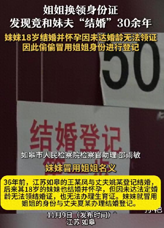 江苏如皋的王某凤36年前与丈夫姚某登记结婚,并育有一子。后来,其18岁的妹妹与夏某结婚并怀孕,但因未达法定婚龄无法领结婚证,也无法办理生育证。妹妹就冒用姐姐的身份与夏某办理结婚登记。