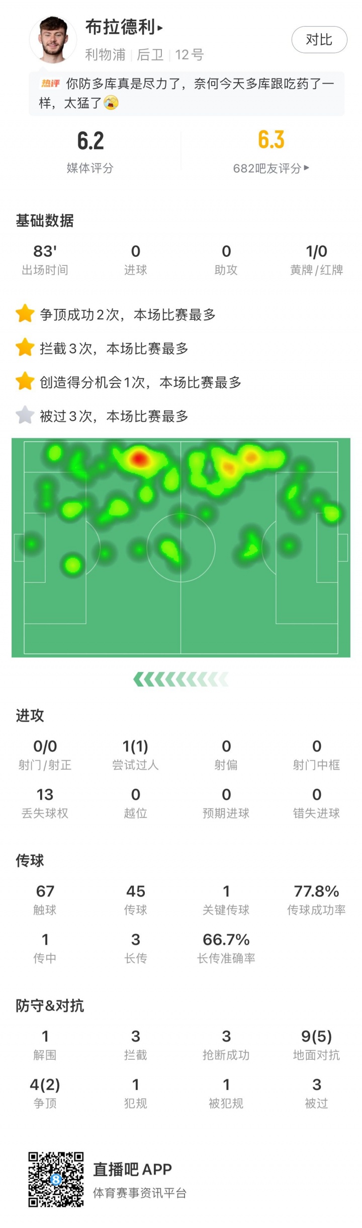 摩西摩西 3 2025-11-10 11:19 布拉德利和维尔茨算是这场除门将外唯二的正常人了,布拉德利被压制的这么惨,下半场还能跑上去送传中呢,尽力了。最大的问题还是斯洛特排的首发战术,其实调整后明显能看出进攻有威胁了。