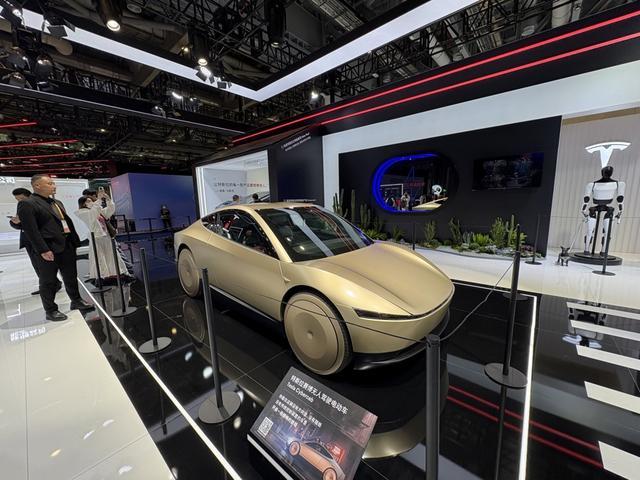 现场看到,特斯拉Cybercab没有方向盘、没有踏板,为全自动驾驶。外观车身呈现金黄色,车轮毂采用全封闭设计。