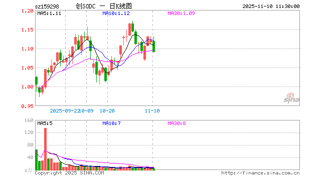 11月10日,截止午间收盘,创业板50ETF大成(159298)跌2.77%,报1.090元,成交额442.64万元。创业板50ETF大成(159298)重仓股方面,宁德时代截止午盘跌2.52%,东方财富涨0.52%,新易盛跌7.37%,中际旭创跌5.75%,胜宏科技跌7.84%,汇川技术跌1.66%,阳光电源跌4.14%,迈瑞医疗涨1.23%,天孚通信跌2.48%,同花顺涨0.88%。