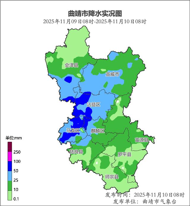 雨情报告(单位:毫米):11月9日08时至10日08时,马龙大部降了暴雨,会泽南部、宣威、沾益和麒麟降了大雨局部暴雨,其余地区降了小到中雨。全市平均降水量23.2,其中马龙45.7沾益42.1麒麟28.3宣威24.5会泽15.4陆良13.4富源12.5罗平11.0师宗8.7。
