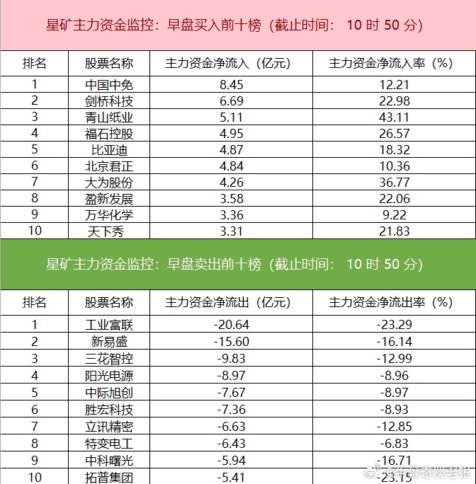 【主力资金监控:中国中免净买入超8亿】今日早盘主力资金净流入商贸零售、食品饮料行业、文化传媒等板块,净流出电子、机械设备、通信等板块,其中电子板块净流出超79亿元。个股方面,中国中免涨停,主力资金净买入超8亿元位居首位,剑桥科技、青山纸业、福石控股获主力资金净流入居前;工业富联遭净卖出超20亿元,新易盛、三花智控、阳光电源资金净流出额居前,,