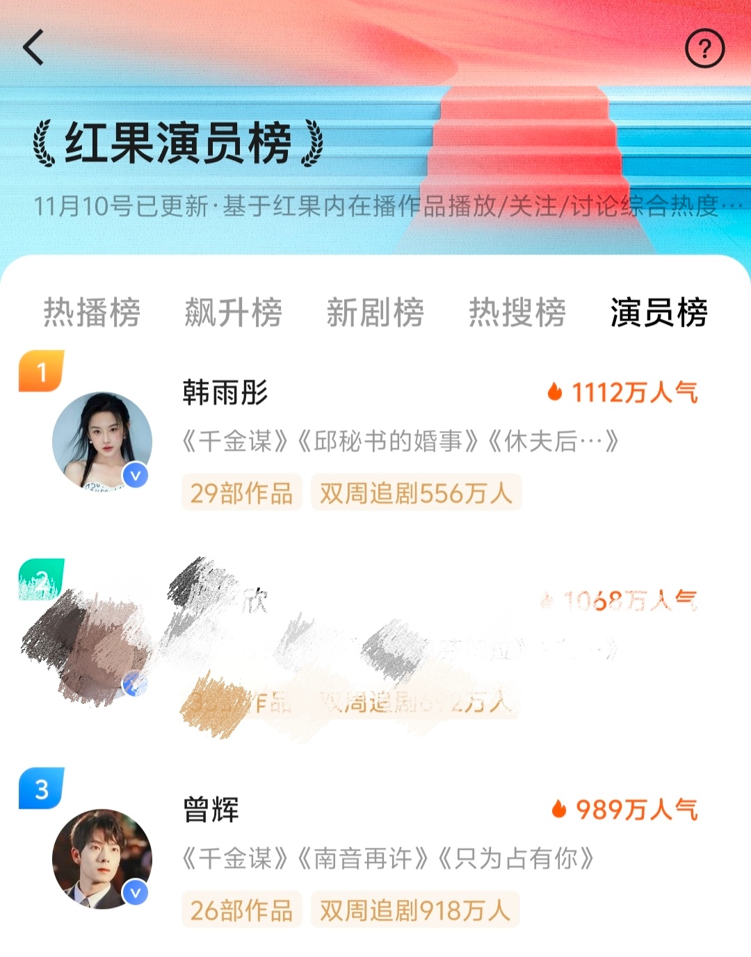 上线两天热度11334万,我们豹猫分别男演员和女演员榜一