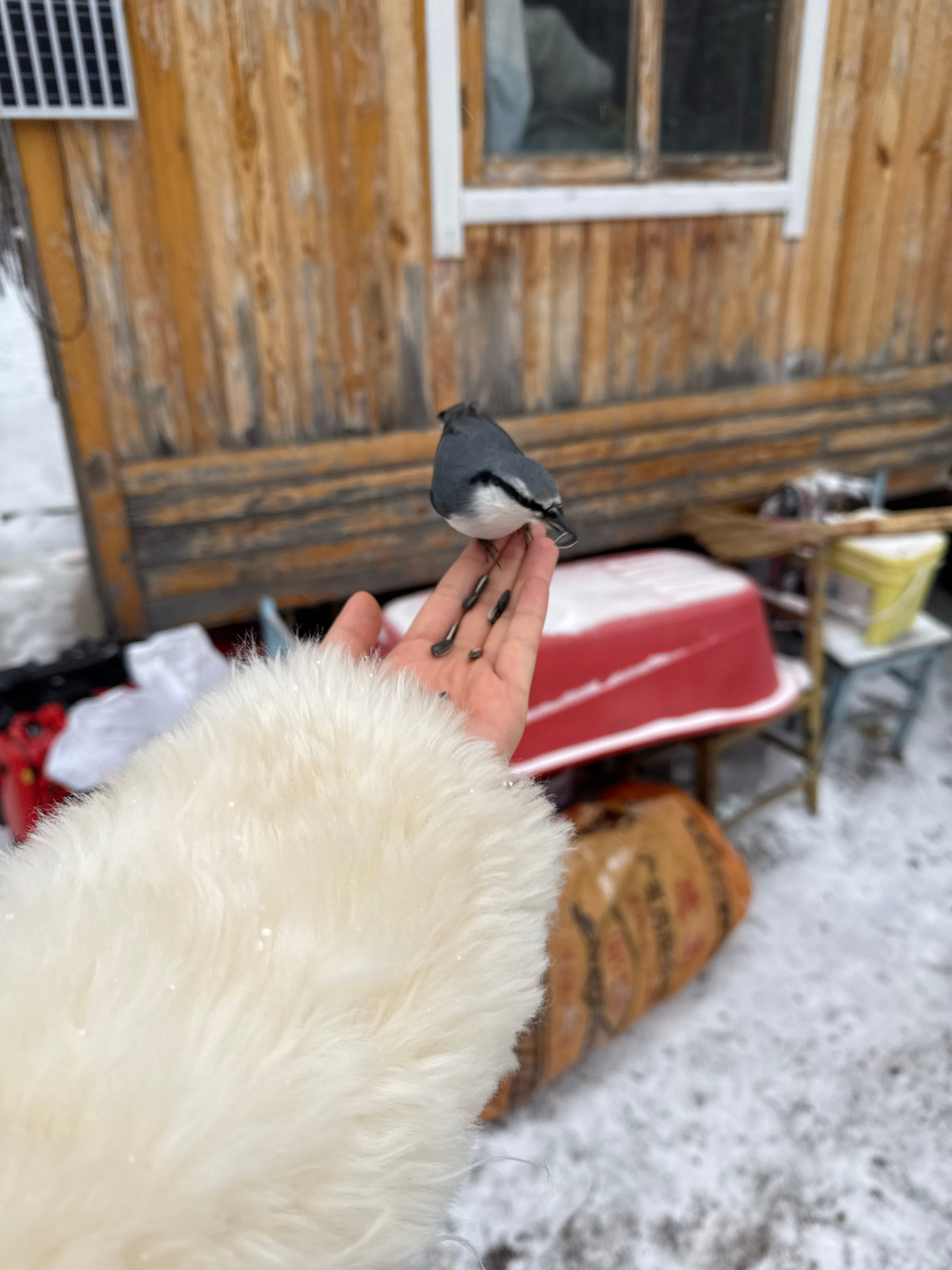 今天去了鄂温克族大哥家里大哥在门口逗鸟,他说这鸟不怕人果然给了一把瓜子这鸟就来了
