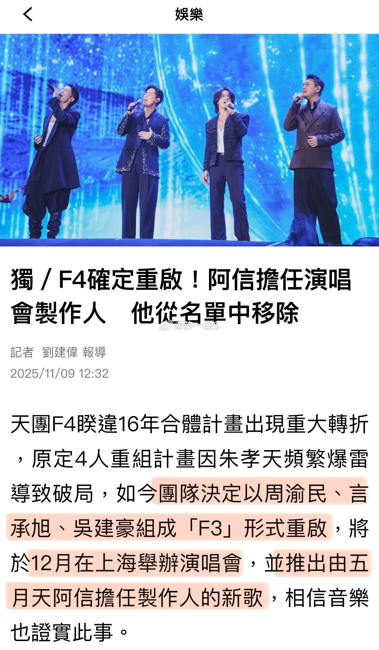 F4回归变F3……有报道说,朱孝天被踢出“重组合体”计划,剩下的F3将于12月在