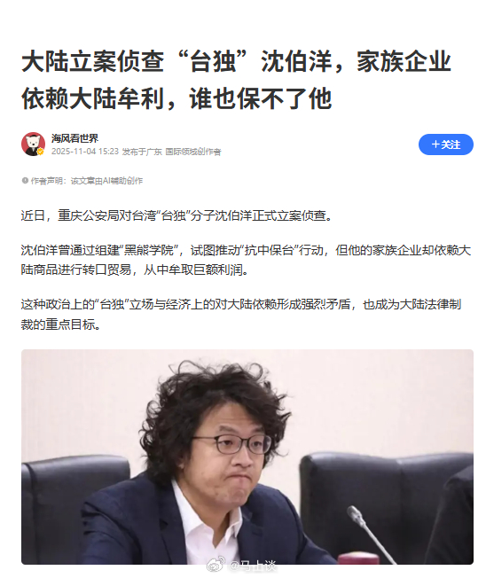 台湾高度关注央视起底沈伯洋 对台独的首恶份子,就是要依法严厉打击!重庆公安此次立案,既是对沈伯洋违法行为有力回应,更是向所有“台独”分子发出明确信号:收手吧,否则下一个是你。[微笑]