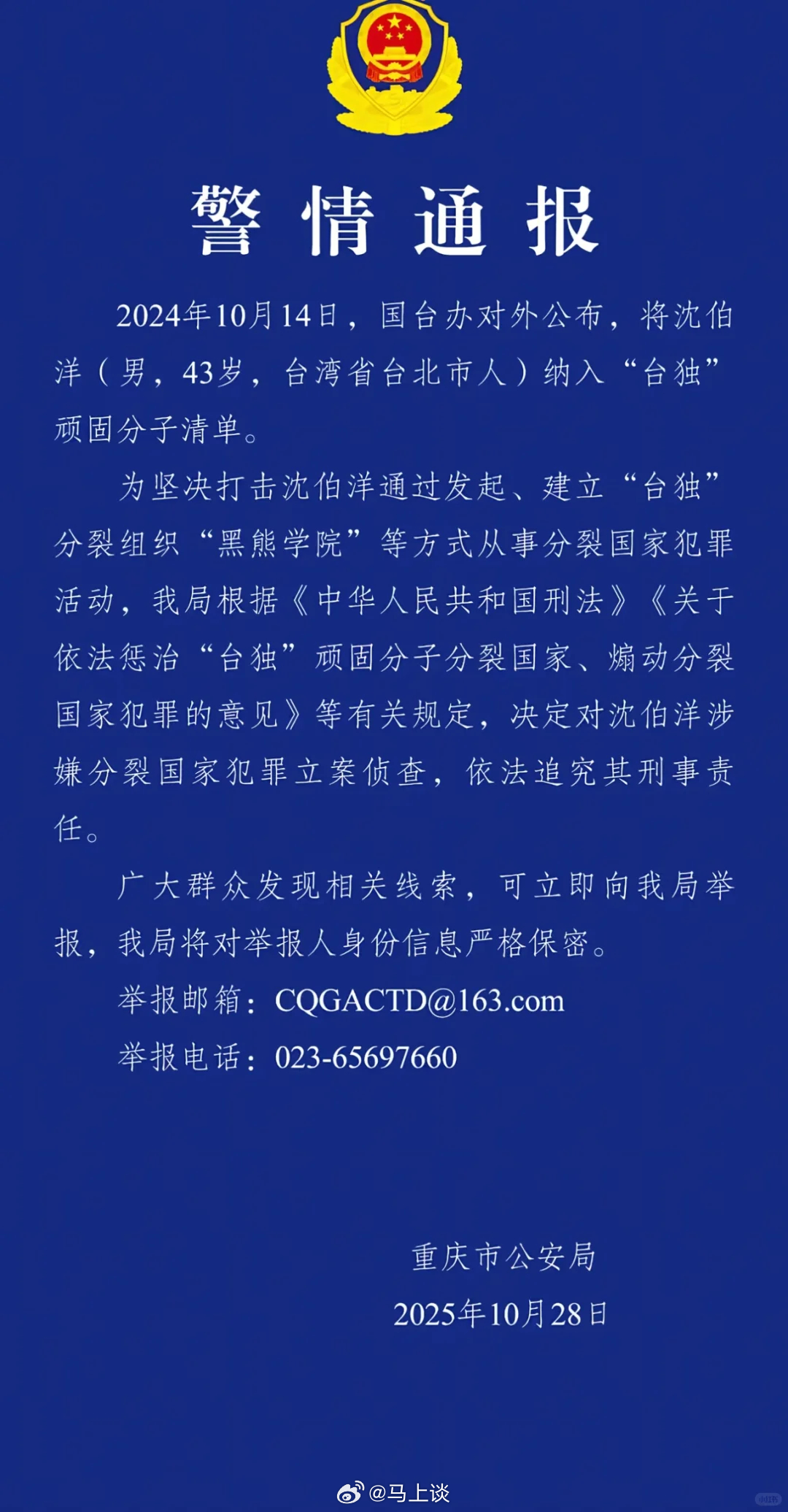 天网恢恢,疏而不漏,沈伯洋累累恶行公之于众!近日,重庆警方表示,已收到台独份子沈