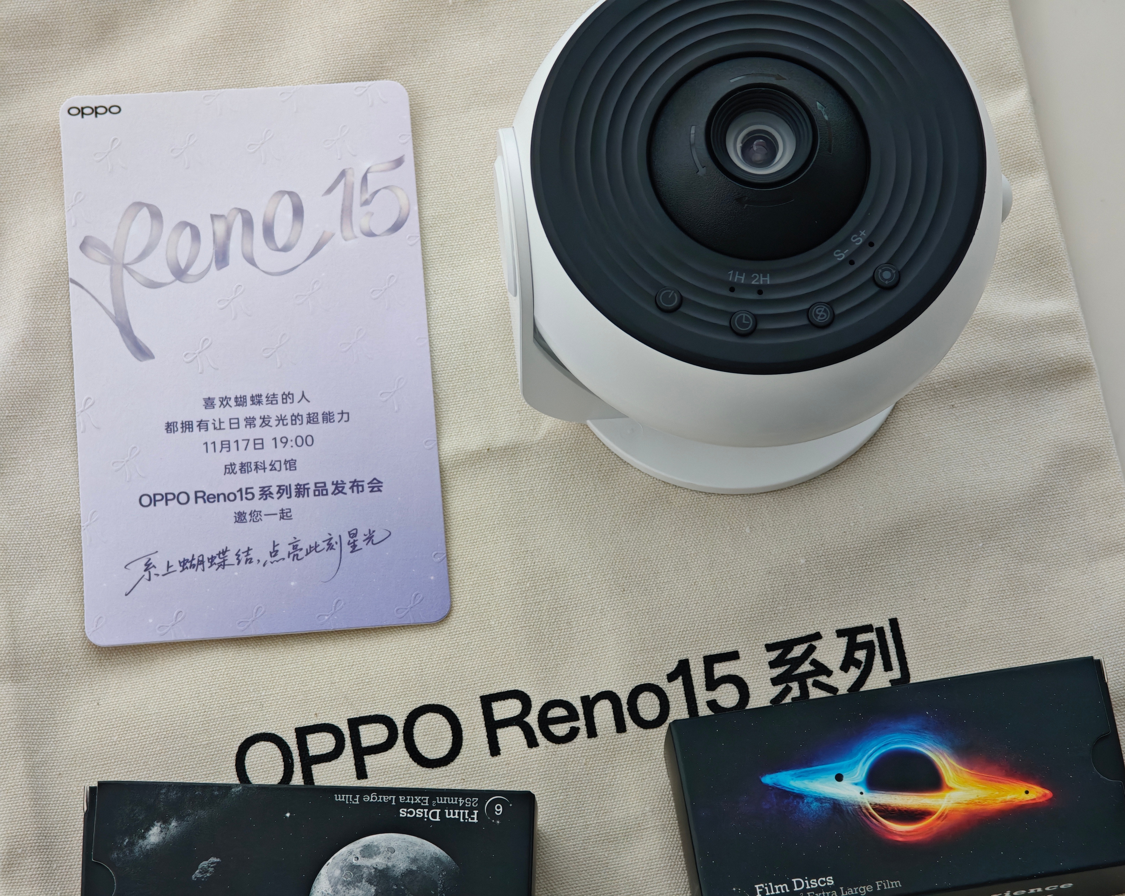 收到OPPO Reno15系列的邀请函啦,里面是一个定制的星空投影灯,还有13款不同风格的灯片。大伙看主题灯片像不像一条泛着星光的蝴蝶结。11月17日19:00,一起看看OPPO Reno15系列如何再次引领潮流设计。
