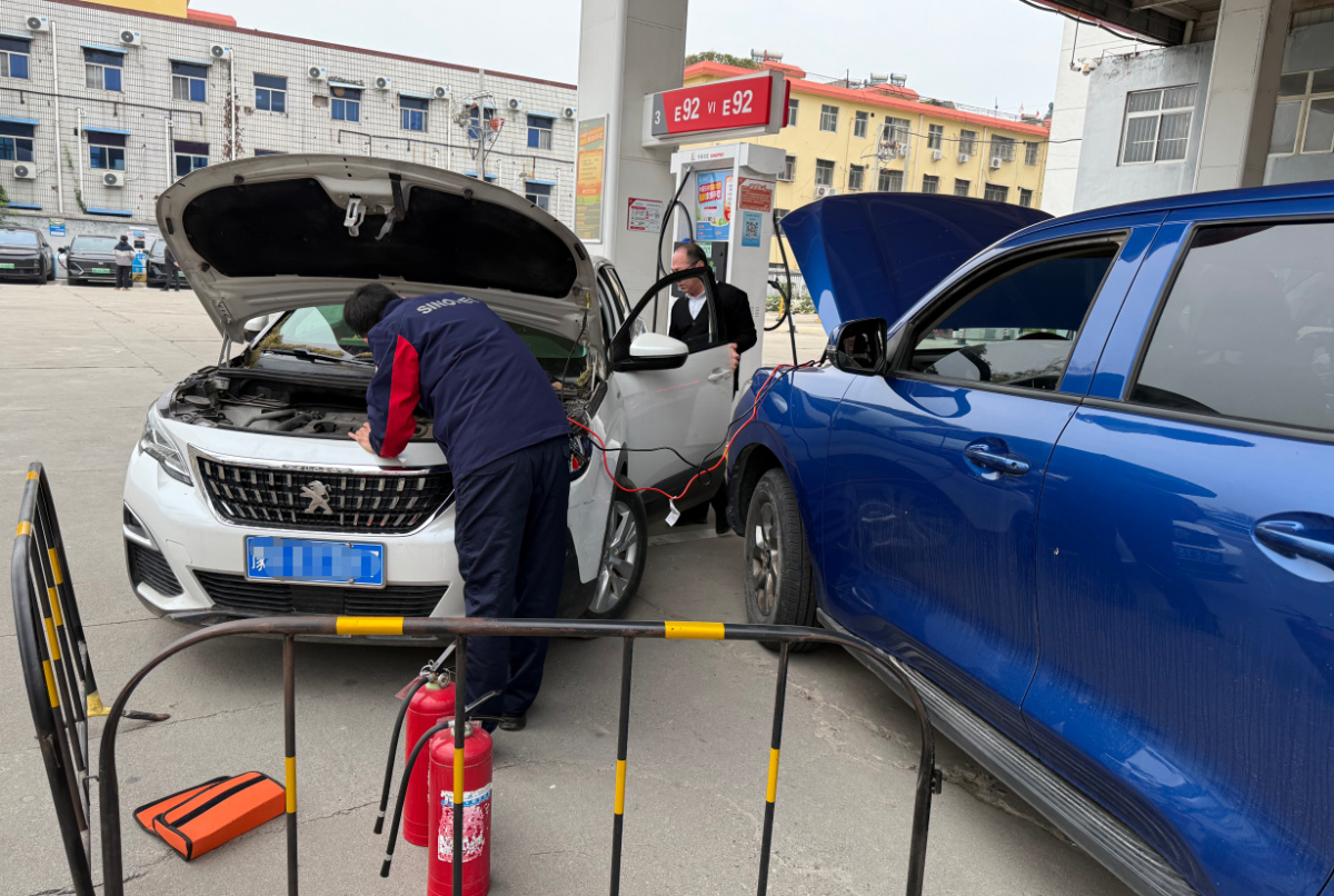 站长通过排查疑是电池故障,找来县公司HSE管理员杨小涛开皮卡车通过电池对接方式成功启动客户车辆,解客户燃眉之急。现场车辆通过率和加油秩序恢复正常。
