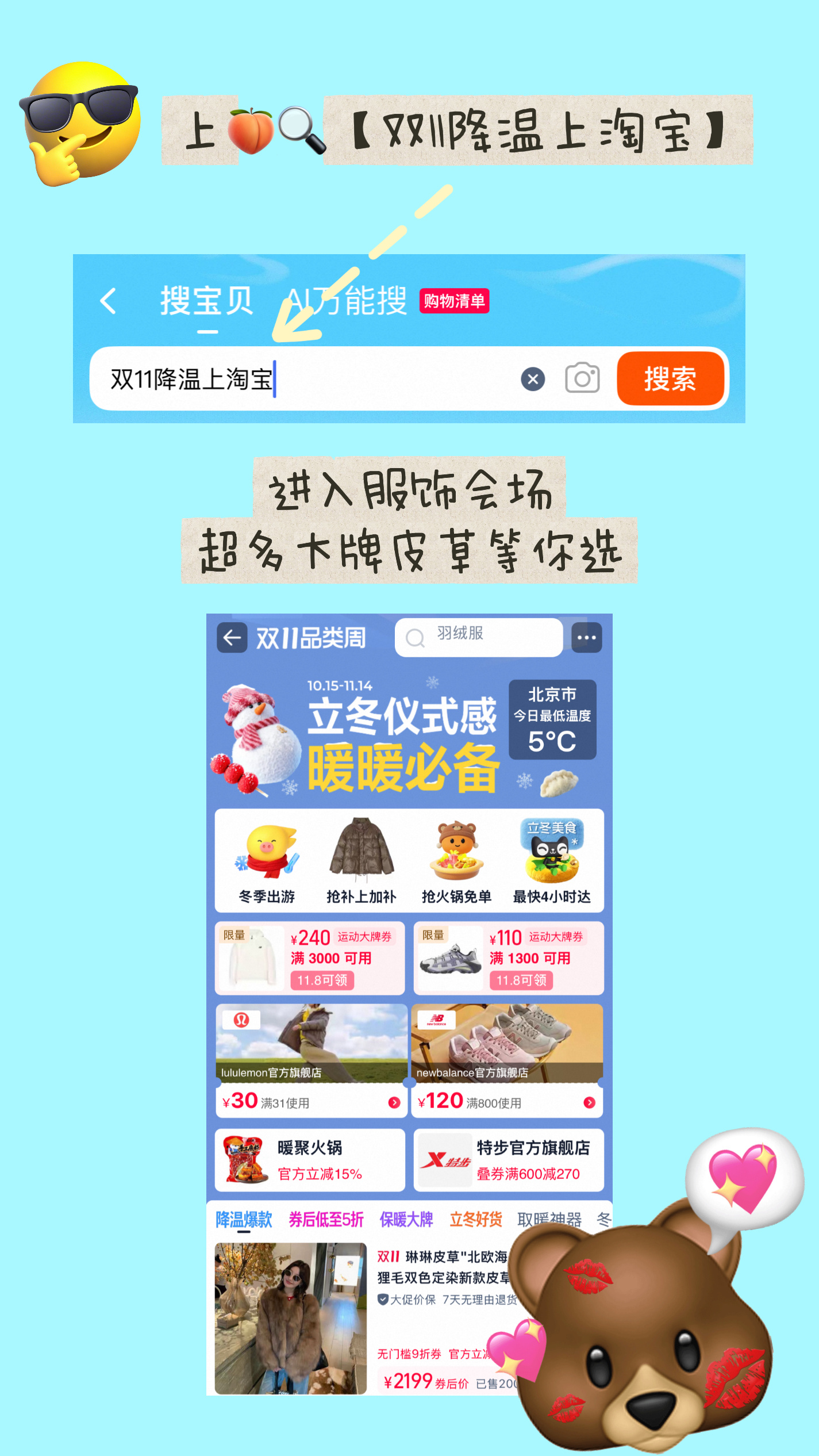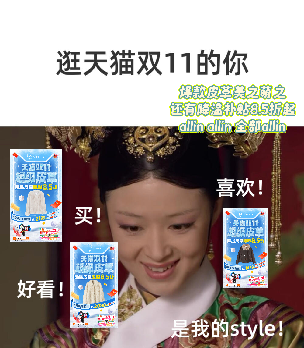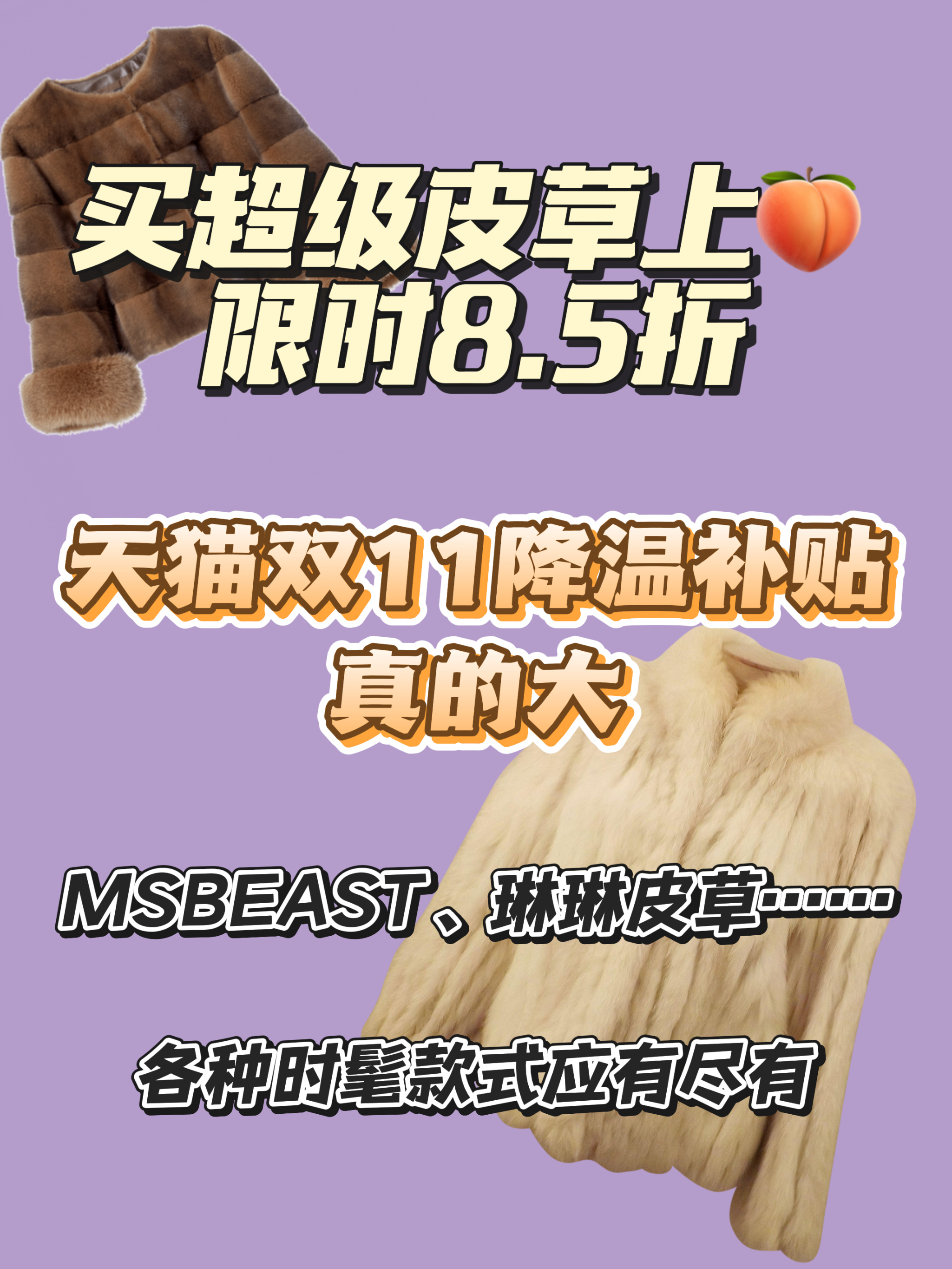 天猫双11降温服饰低至5折 天猫立冬降温补贴5折真香 太好了,「超级皮草」来啦,要说秋冬穿啥最有氛围感,那当然是皮草了,冬日出片神器真不是说说而已!仿貂绒、环保皮草全是秋冬经典时尚单品!即刻上淘宝搜索「双11降温上淘宝」,皮草品类限时8.5折起,马上下单火速出片!!!天猫双11才是真优惠