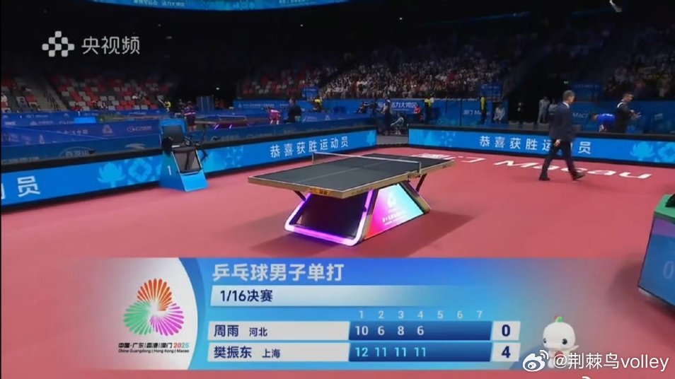 东哥全运首show,完胜对手晋级16强,樊振东4比0战胜周雨 。四局比分:12-10、11-6、11-8、11-6。下一轮对手薛飞。