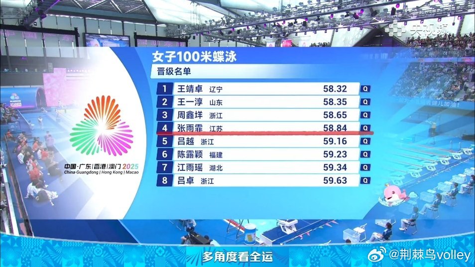 张雨霏全运首show100米蝶泳小组第一,晋级半决赛。