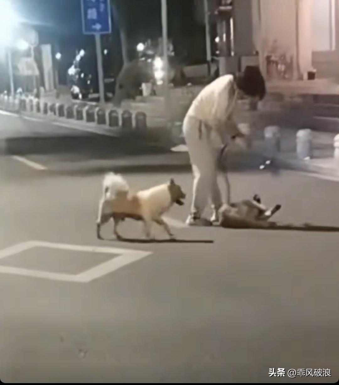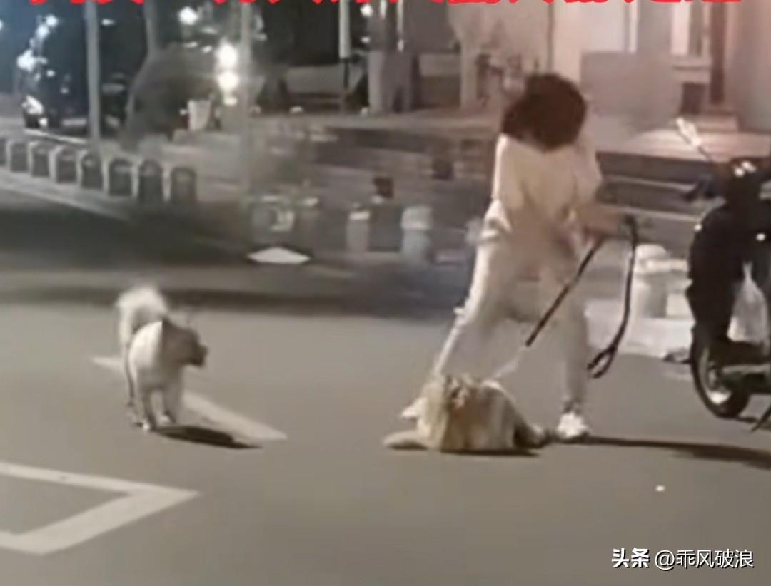 女主人牵着狗狗在路上遇到一只小狗,自家狗狗不肯走,女主人一脚将它撂倒,拿起牵绳往它身上抽。养狗遇事需先冷静处理。大狗路遇小狗