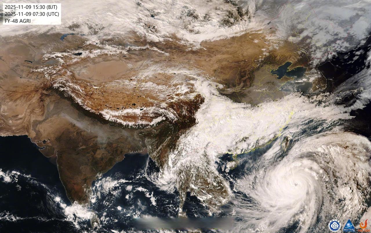 11月9日下午,卫星云图上超强台风凤凰巨大壮观的云系已经将菲律宾全国完全笼罩,北侧的副高在台风与锋面云系挤压下处于断裂的边缘。