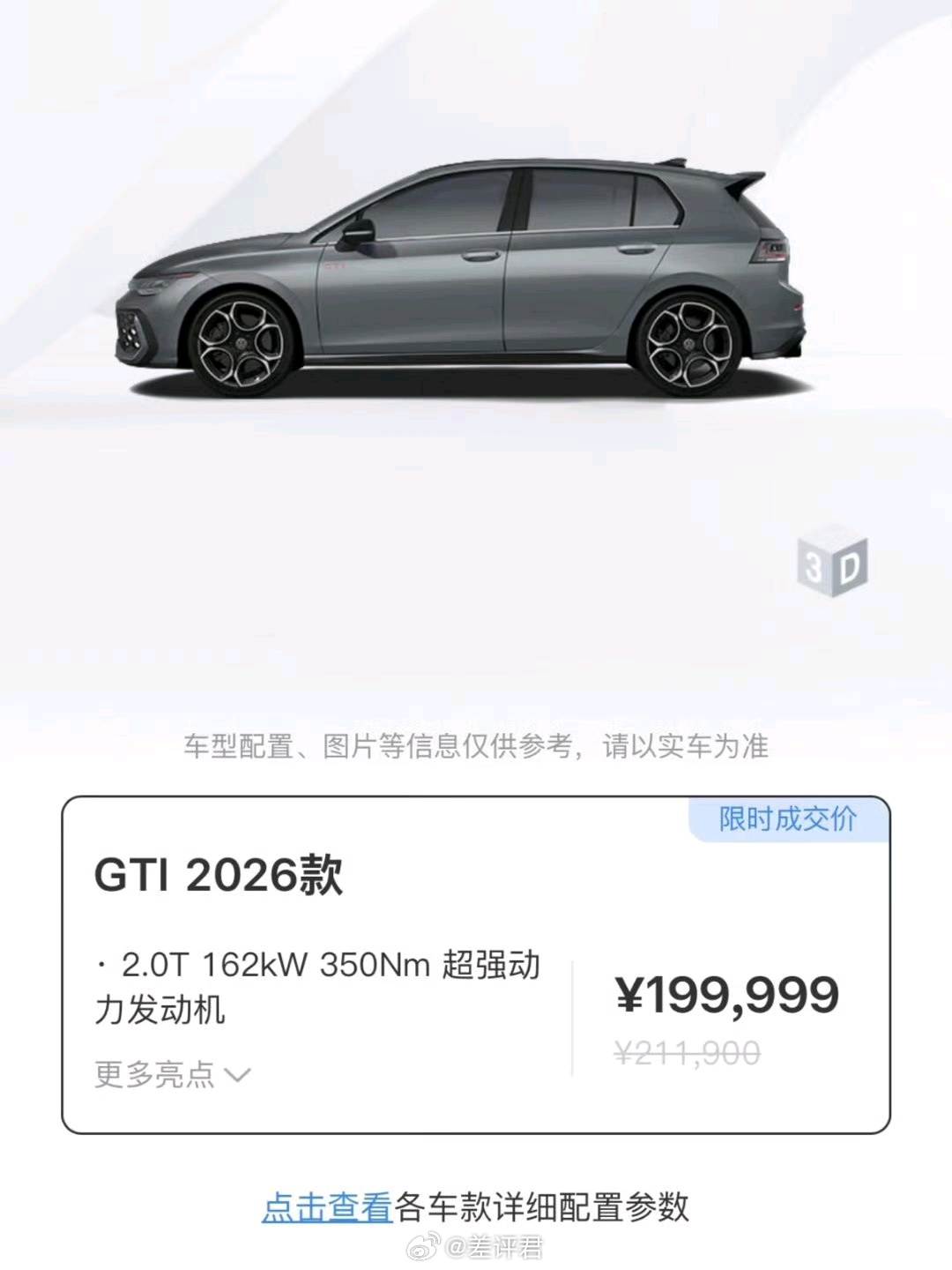 #差评说车# 在这个10万出头就能买到“电钢炮”的年代,像高尔夫GTI这样的燃油钢炮还有生存空间吗?一代人的Dream Car,现在20万的价格,已经比初次引进时候便宜不少了,但这个价位的竞争,已经可以用变态来形容了。GTI没有变,但市场和大家买车的心态变了。