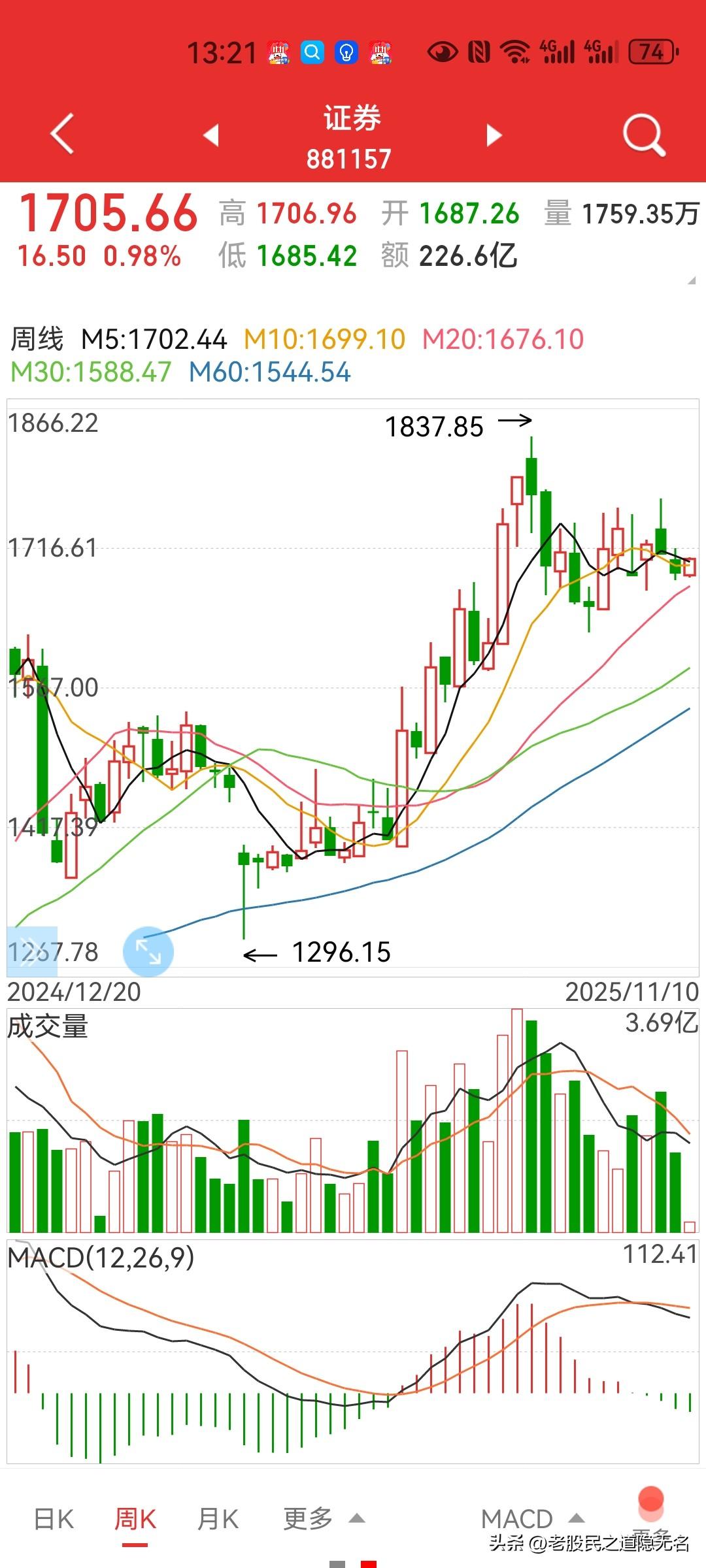 短线什么板块攻守皆宜? 个人认为有两个: 券商+军工! 1,券商。 短线来说,位置够低(下图1),与指数4000点的位置,不够匹配,有“补涨”要求,且要让大家习惯4000点,需要他来支撑。 当然,如果中线看(图2,周K),位置又觉得高,如果大盘来一波中期调整,这个货又往往“首当其冲”![捂脸][捂脸] 辩证地看吧。 2,军工。 军工板块实际上与券商比较类似,也是妥妥的“渣男”,也同样短线趋势上看上攻欲.望强烈,中线一样面临券商板块同样的窘境。 不过两者短线来说,相较其他的板块,又是攻守皆宜,进可攻,退可守。 都是在9月初提前调整过的,短线的安全性好一些。 所以,短线拿着这俩货还是好睡觉的。[呲牙][呲牙]