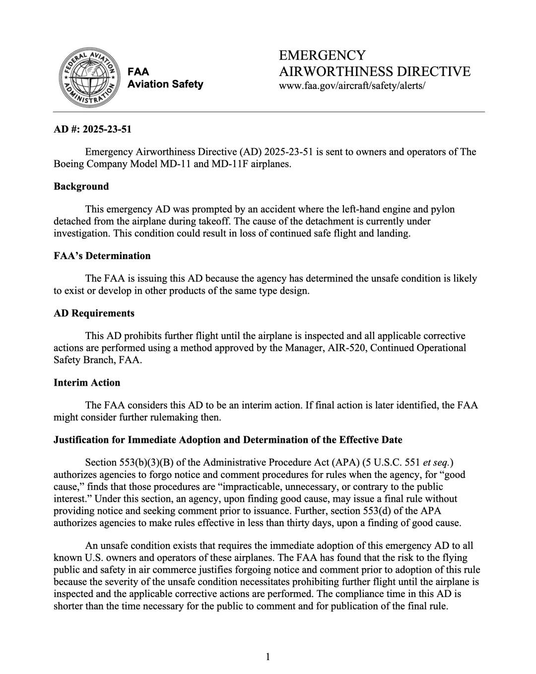 货机坠毁事件后全面停飞,MD-11未来何从? 上周,UPS的一架MD-11货机在美国肯塔基州起飞时,左侧发动机和吊架从飞机上脱落坠毁,造成至少14人死亡。日前,美国联邦航空局(FAA)紧急适航指令,要求所有在美国注册的108架MD-11和MD-11F型飞机立即停飞,进行检查。 MD-11最初由麦道公司于1988年生产,直到1997年该公司与波音公司合并。在进入21世纪后,由于运营效益等原因,MD-11已经完全退出客运用途,并大量改装为货机使用。但是,自推出以来,MD-11的飞行控制系统就存在问题,导致了多起事故。此次FAA在适航指令中称,虽然目前仍在调查此次脱离事故的原因,但这种状况很可能存在于或发展到同类型设计的其他产品中。而事故发生后,UPS与FedEx出于安全考虑,均已主动停飞了各自的MD-11机队。此次事故飞机的机龄已高达34年,据美国国家运输安全委员会(NTSB)显示,这架飞机在事故发生前几周,刚刚在德克萨斯州进行过一次大修。 如果FAA的后续检查发现这是普遍存在于同型号飞机的缺陷,那么修复的成本和时间对于运营商来说可能是难以承受的。届时,本已逐渐淡出舞台的MD-11机队,其退役的进程恐怕将被迫大大提前。那么,「三发时代」的经典传奇还能在天空中延续多久? (图为MD-11资料图,仅供示意) 通行线 MD11 波音 货机 航空