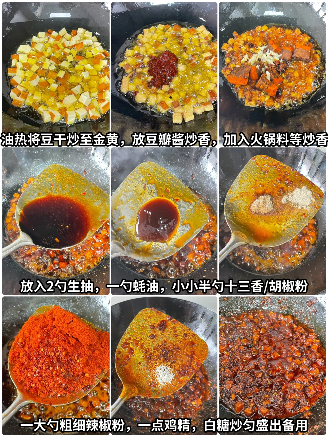 3⃣️炒酱料:起锅烧油,油热将豆干中火炒至金黄,放入豆瓣酱炒出红油,加入火锅料蒜、花椒炒出香味炒化。转小火,放入两勺生抽,1勺蚝油,小小半勺十三香和胡椒粉,翻炒均匀,再根据自己吃辣的程度加入辣椒粉。一点我们家能吃,所以加了一大锅铲,一点鸡精、白糖。炒匀盛出备用。