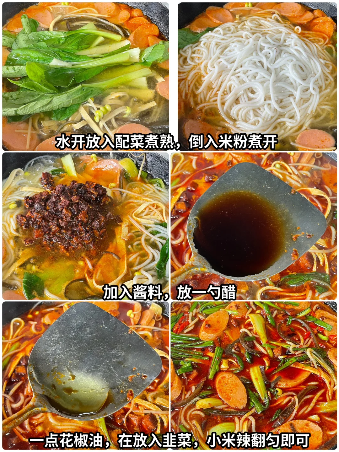 4⃣️起锅烧水,水开放入配菜煮熟,倒入米粉煮开,再加入酱料煮开。放入适量的醋,一点点花椒油。进行调味。最后再放入韭菜、小米辣。即可这样做出来的。香豆干米粉,豆干越嚼越香,米粉顺滑,再加上满满的辣味。真的巨好吃,喜欢的姐妹一定要去试试