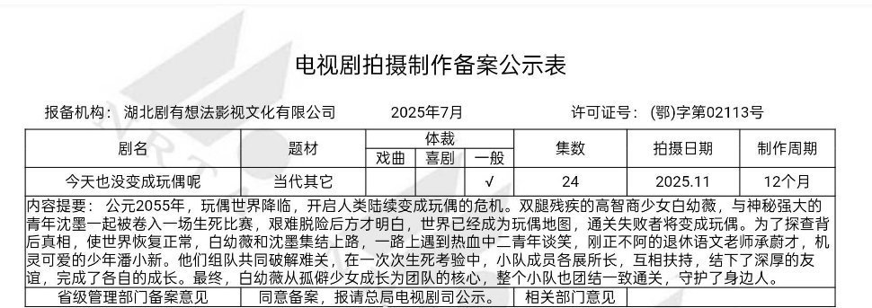 《今天也没变成玩偶呢》陈都灵、陈靖可,导演:章笛沙,编剧:云川编剧工作室,世界观:张卓,预计2月开机