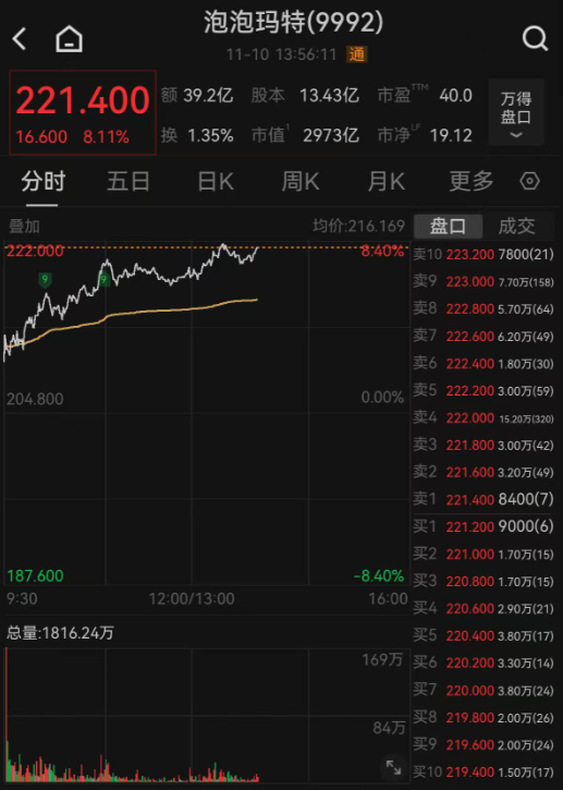 上证报中国证券网讯(记者何漪)11月10日,泡泡玛特高开高走,午后震荡上涨超8%。截至13点56分,泡泡玛特报221.4港元/股,上涨8.11%;交易总额达到39.2亿港元,市值达2973亿港元。