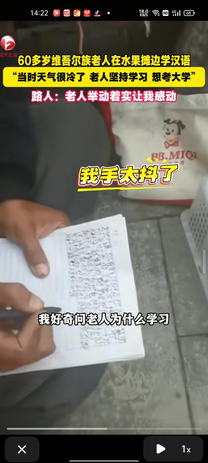 11月7日,阿克苏地区库车市。网友晒视频称,一位六十多岁的维吾尔族老人在水果摊卖水果,当时11月的新疆非常冷,老人坚持在闲暇之余学习汉语汉字,因为手太抖才导致写字难看。询问老人后得知,孩子上大学了,他也要多学习。