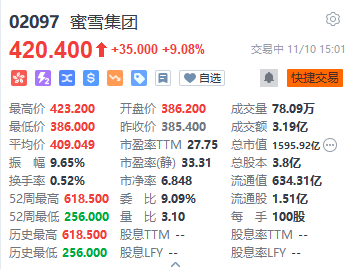 上证报中国证券网讯(记者何漪)港股新消费概念午后涨幅扩大,蜜雪集团最高价报423.2港元。截至15点01分,蜜雪集团报420.4港元/股,上涨9.08%,成交金额达到3.19亿港元。