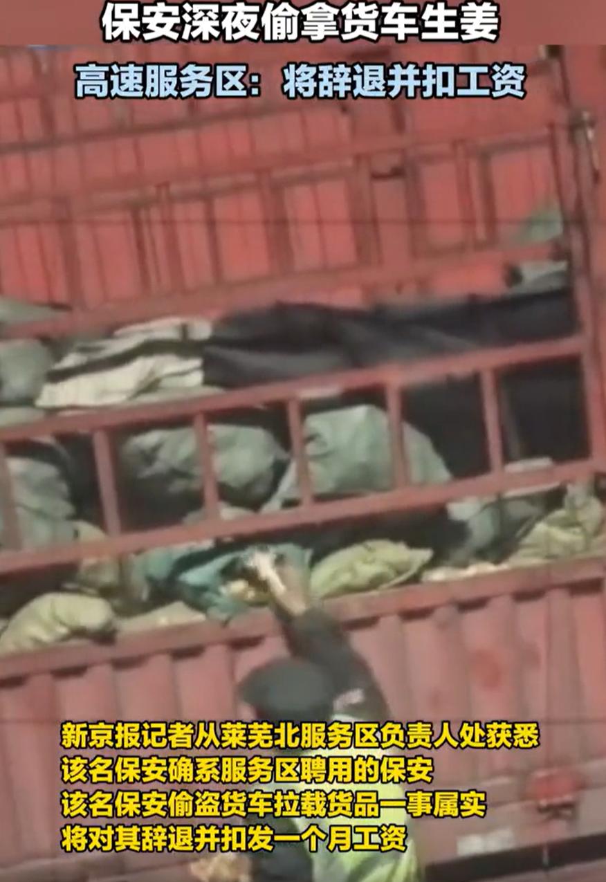 山东莱芜,一位大车司机跑高速时把车停在服务区,半夜起夜时,突然看到两名穿着保安衣服的人在车旁边不知道干嘛,司机在旁边用手机偷偷录下来,发现两人竟然在偷拿货车的生姜,虽然拿走的不多,但这种行为却让人很不舒服 事情发生在11月9日凌晨,这位常年跑长途的司机师傅,已经连续开了近十个小时的车,眼皮都快粘到一起,好不容易赶到莱芜北服务区,他仔细停好满载货物的货车,确认货物固定妥当后,才拖着沉重的脚步钻进驾驶室,只想趁着深夜车流量少,好好睡上几个小时,为接下来的路程养足精神。 凌晨两三点钟,一阵尿意让他从睡梦中醒来,彼时服务区里一片寂静,大部分车辆和人员都还沉浸在熟睡中,他揉着惺忪的睡眼,裹了件外套就下了车,刚走到货车侧面,眼角的余光突然瞥见车尾部有两个模糊的身影在晃动。 起初他以为是其他司机或者服务区工作人员在巡查,并没太在意,可走近两步后,却发现那两人穿着标志性的保安制服,正围着自己货车的货箱低声嘀咕着什么。 “这么晚了,保安围着我的车干嘛?”一丝警惕涌上心头,司机师傅没有贸然上前,而是悄悄往后退了几步,顺手掏出手机打开了录像功能,借着服务区微弱的路灯,远远地记录下了眼前的一幕。 视频里能清晰看到,其中一名保安先是伸手摸了摸货箱里的货物,确认是袋装生姜后,熟练地解开了包装袋的绳结,另一名保安则在旁边望风,时不时四处张望,生怕被人发现。 随后,解袋的保安弯腰从里面抓了几把生姜,塞进自己的口袋里,两人交换了一个眼神后,便匆匆朝着服务区保安室的方向走去,全程不过几分钟,动作却显得格外“熟练”。 司机师傅凑近检查后发现,被拿走的生姜数量确实不算多,也就够一顿菜的量,算不上什么大损失。可一想到对方的身份,他心里就特别不是滋味:“保安本来是保护我们安全、看管财物的,结果却干起了偷拿货物的事,这也太说不过去了。”越想越觉得膈应,他便把这段偷拍的视频发到了网上,想让大家评评理。 视频一经发布,很快就吸引了众多网友的关注,相关话题迅速登上本地热搜。莱芜北服务区工作人员得知情况后,第一时间启动了核查程序,通过调取服务区内的监控录像、与涉事保安当面核实等方式,很快确认了两人偷拿生姜的行为属实。 这两名涉事人员均为服务区外包聘用的保安,并非正式编制员工,随后,服务区迅速给出了处理结果:当即对两名涉事保安予以辞退,扣除其当月全部工资作为处罚,同时要求两人向货车司机诚恳道歉。 山东高速实业发展有限公司也第一时间发布官方声明,向广大网友和过往驾乘人员表达了歉意,称这件事充分暴露了公司在人员管理、日常监督等方面存在的漏洞,已经安排专人与货车司机进行了面对面沟通,详细询问了其是否有其他损失,并获得了司机的谅解。 声明中还提到,后续将全面开展服务区安保人员专项整改,加强岗前背景审查、职业操守培训和日常巡查监管,在各个服务区增设货物安全提示牌,建立投诉快速响应机制,坚决杜绝类似情况再次发生。 事件曝光后,网友们也纷纷留言表达自己的看法: 有网友说:“保安的职责是看家护院、维护秩序,结果监守自盗,哪怕只是几块生姜,也丢了职业操守,太让人失望了”; 还有网友评论:“跑长途的司机多不容易,风餐露宿的,货物都是辛苦钱,保安拿这点东西值不了几个钱,可寒的是司机的心”; 这件事看似是“偷拿几块生姜”的小事,却折射出不少值得深思的问题,对于服务行业来说,职业操守不分岗位高低,哪怕是看似平凡的保安工作,也肩负着守护他人安全与财产的责任,一时的贪小便宜,不仅丢了自己的脸面,更毁了所在单位的信誉。 而对于服务区这类面向公众的场所,管理不能只停留在表面,人员招聘的把关、日常工作的监督、违规行为的惩处,每一个环节都不能松懈,只有把细节落到实处,才能真正让过往的驾乘人员感受到安心与放心。 那么你们怎么看待这件事呢?欢迎在评论区说说你们的看法吧!