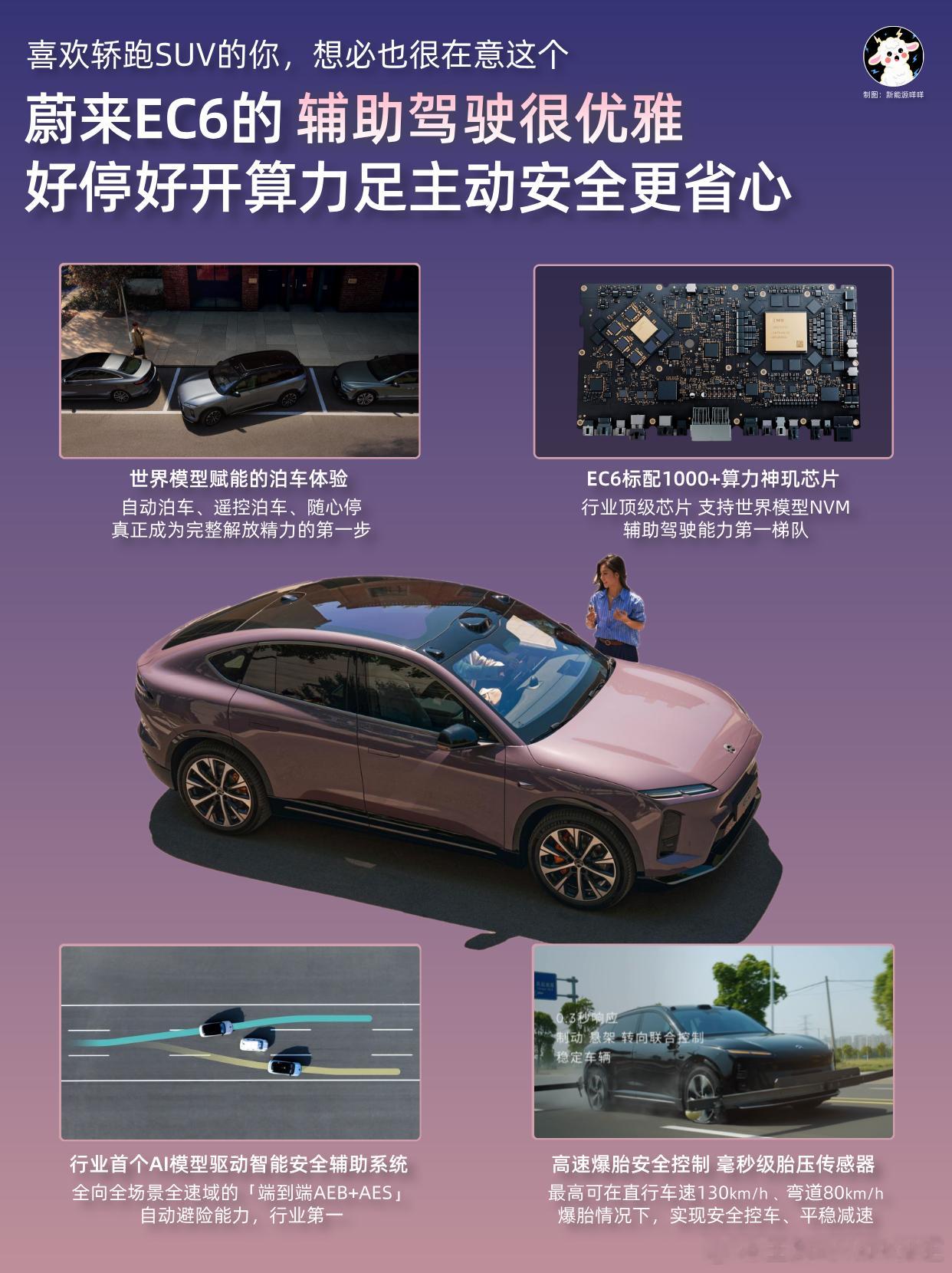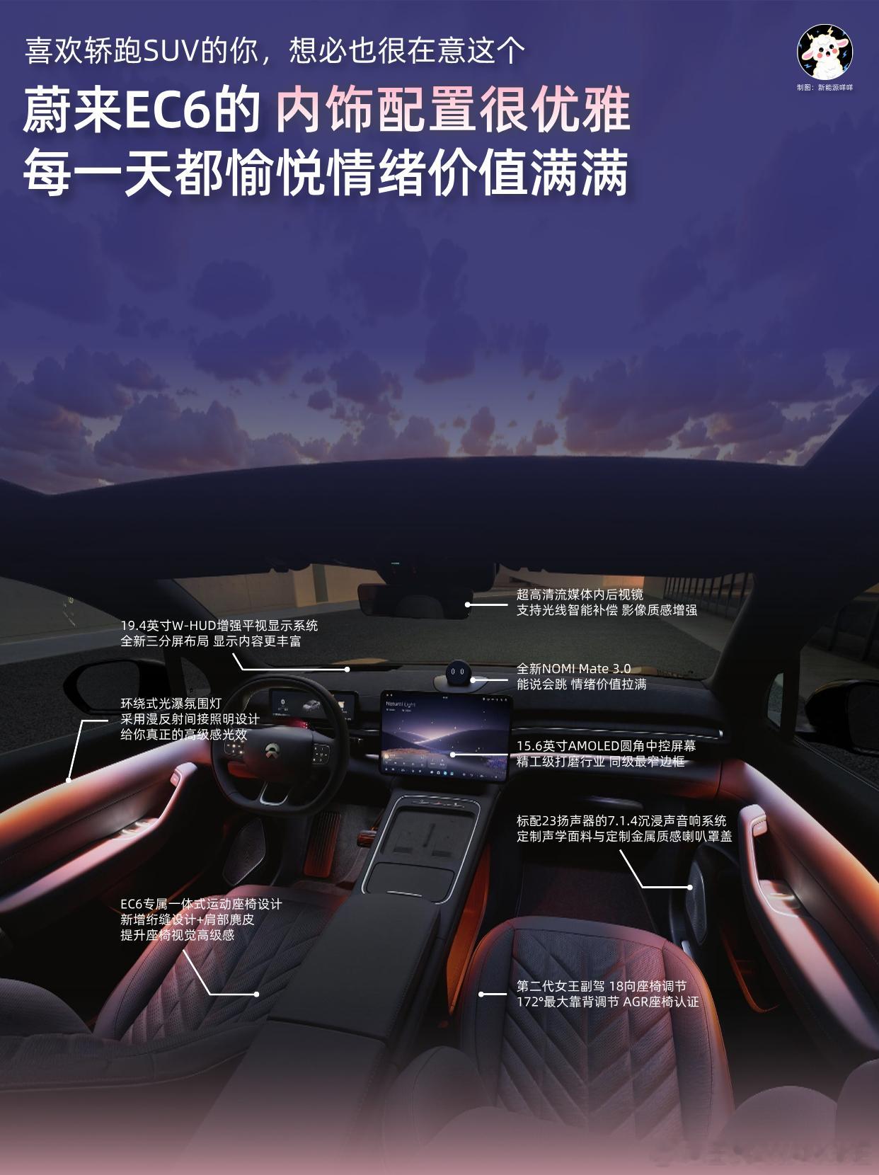 蔚来EC6堪称轿跑SUV的宝藏之选。颜值上,极具雕塑感的线条、独特双模尾翼,搭配灵境紫等质感车色,美得独树一帜。豪华体验也不逊色,用料工艺尽显高端,高级感拉满。智能配置更是领先,高性能芯片等“新三大件”加持,还有第三代智能系统,带来超多智能升级。补能也便捷,可充可换可升级,出行无焦虑。再加上产品、服务、社区的独特优势,深受都市精英和BBA老用户青睐,选它准没错!