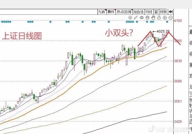 第一,大家请看图二今天上证指数的收盘点位4018点,近期的最高点4025点。明天马上面临前期高点突不突破的问题?以及突破之后能不能稳住的问题?或者冲高回落的问题?更简单一点说,当前这个位置面临短线双头的可能性。