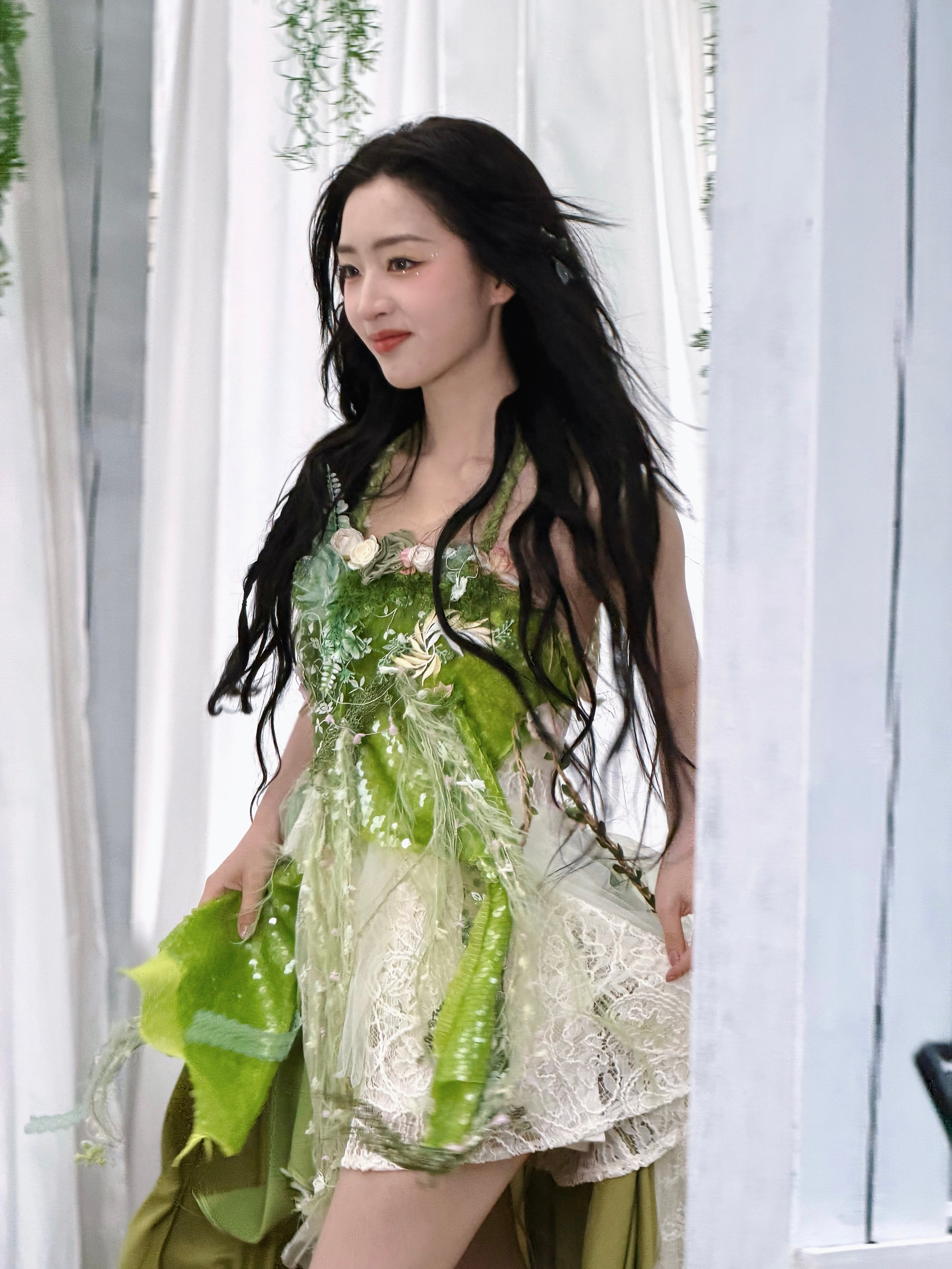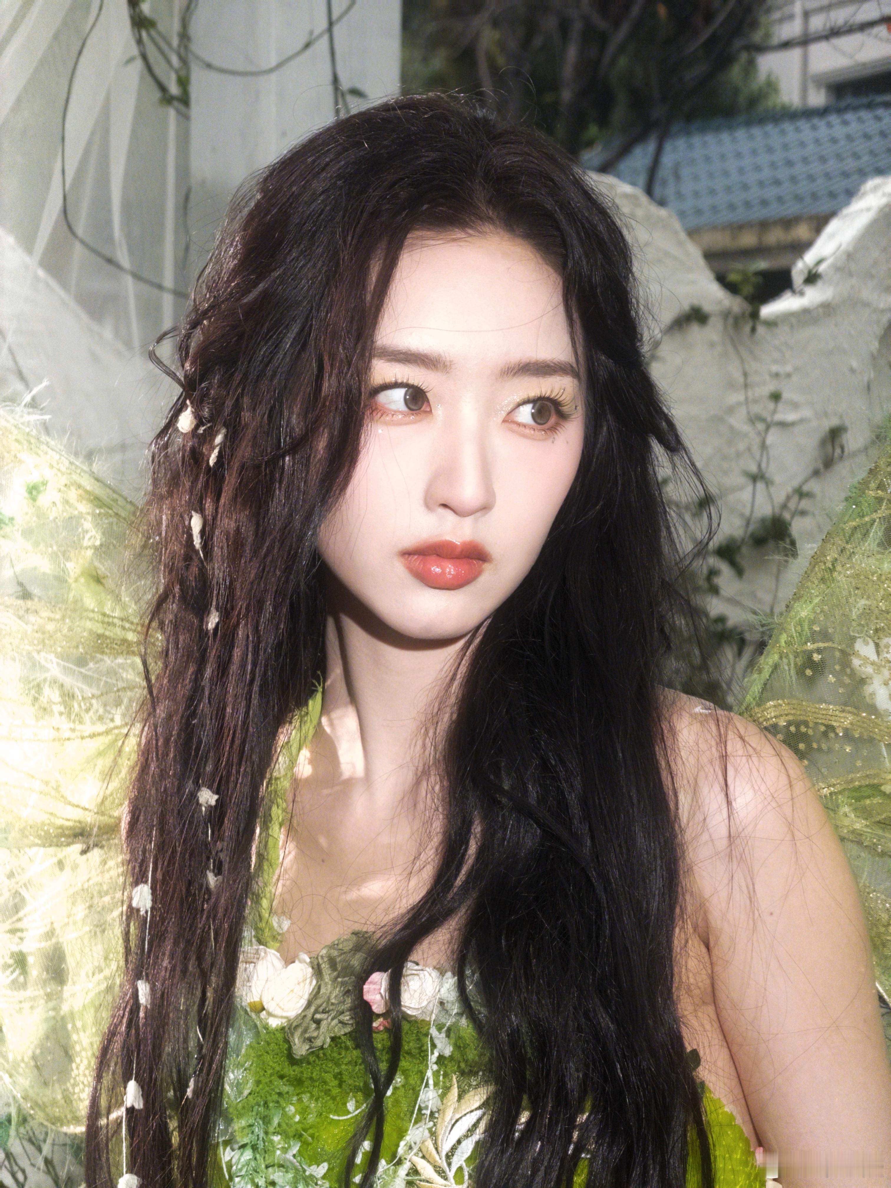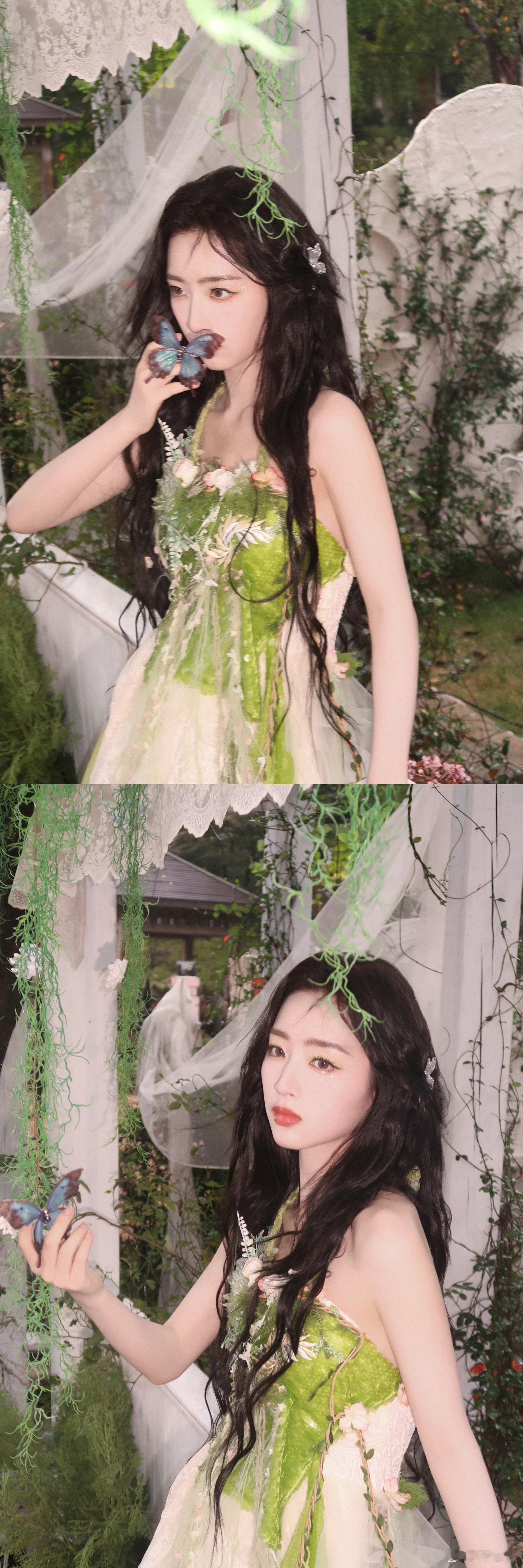 邓恩熙是精灵本灵吧!薄纱翅膀配丝绸绿裙,完全绿野仙踪里跑出来的灵气少女啊,妹宝今天真的好美啊! 双11疯狂好六夜