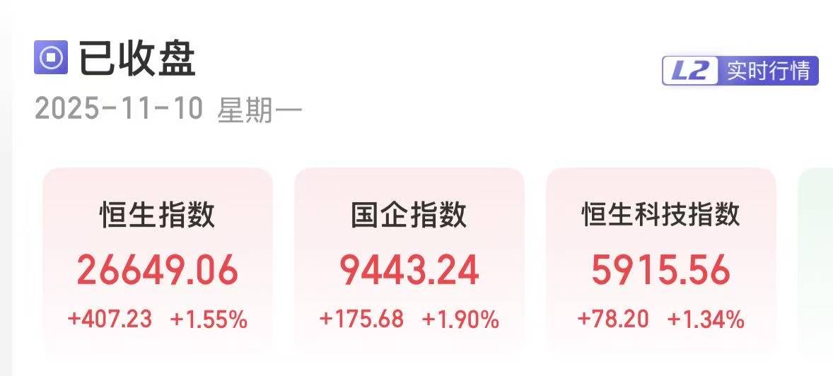 上证报中国证券网讯(刘禹希记者严晓菲)11月10日,港股三大指数集体收涨。截至收盘,恒生指数涨1.55%,报26649.06点;恒生国企指数涨1.90%,报9443.24点;恒生科技指数涨1.34%,报5915.56点。
