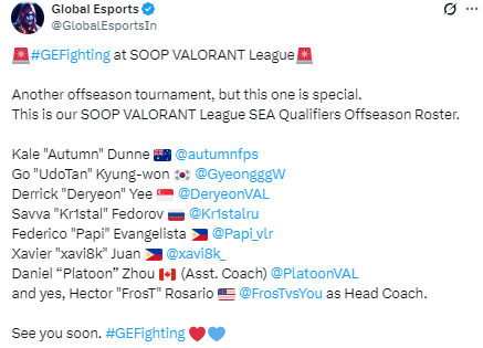 虎扑11月10日讯太平洋赛区战队GE宣布SOOP无畏契约联赛东南亚选拔赛阵容: