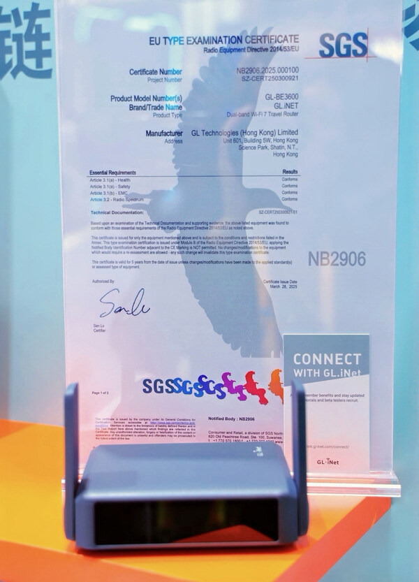 上海2025年11月10日/美通社/--2025年11月8日,在第八届中国国际进口博览会上,国际公认的测试、检验和认证机构SGS正式为深圳市广联智通科技有限公司(以下简称"广联智通")的Wi-Fi7便携路由器BE3600颁发FCCID证书和CERED证书。SGS电子电气服务部科技电子产品线总监许国科与广联智通产品线负责人张迪平等领导出席了此次颁证仪式。