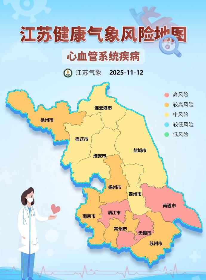 【注意防范!江苏健康风险地图】 据@江苏气象 消息:预计未来2天,江苏心血管疾病发病风险较高,预计全省大部分地区风险等级可达较高风险,建议注意及时增减衣物,饮食摄入多样化,保持良好心态,可适度进行室外运动。