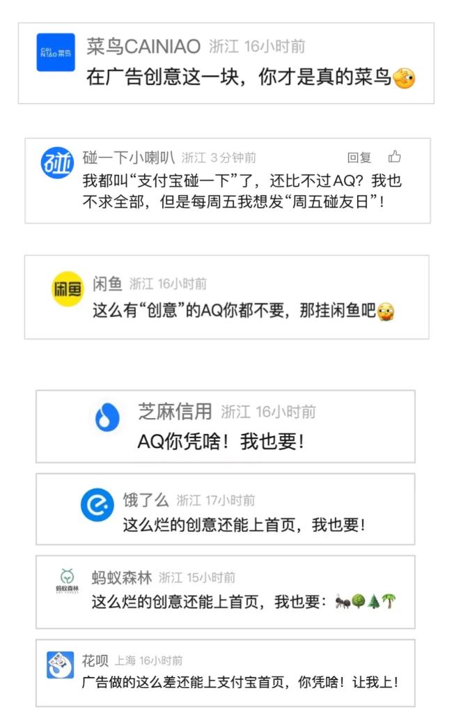与此同时,AQ营销上的种种拉胯表现,也让其他兄弟姐妹醋意横生,跟着支付宝的脚步下场吐槽。