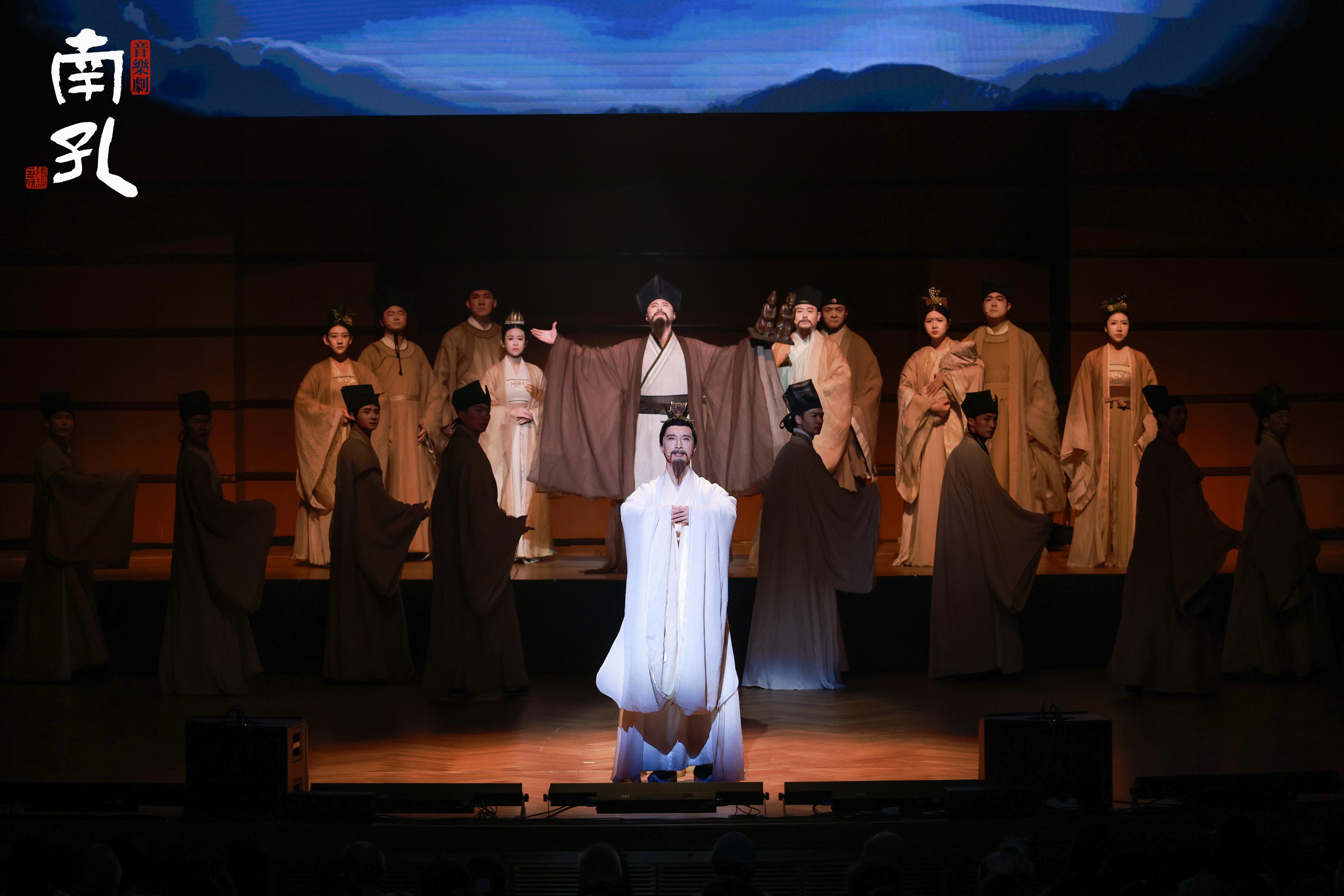 音乐剧《南孔》由浙江歌舞剧院有限公司创排,自2023年首演以来,已在国内50余座城市巡演近130场。该剧以南宋“孔洙让爵”史实为蓝本,讲述孔子第53世嫡长孙孔洙为守护儒学文脉,深耕江南传播礼乐的故事。演出中,“有朋自远方来”等经典唱段与现代舞台艺术交相辉映,既展现了儒家“礼”文化的深厚内涵,又通过国际语汇引发观众情感共鸣。
