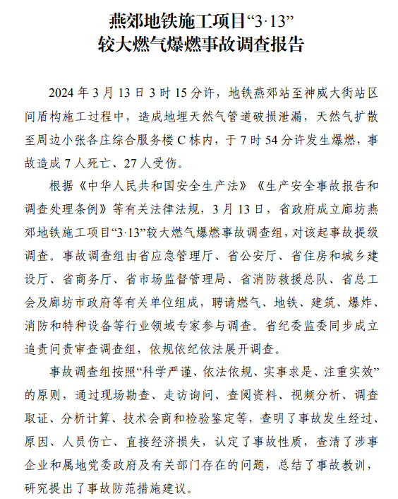 致7死27伤,河北燕郊较大燃气爆燃事故调查报告公布:施工作业时造成临近天然气管道破损,导致大量天然气泄漏