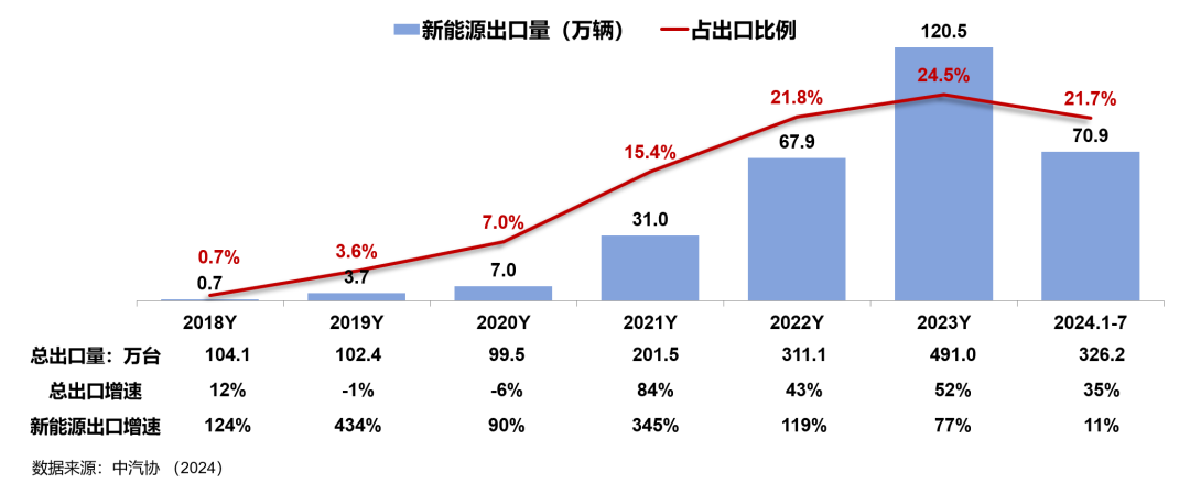 2024年1月至7月,新能源汽车的出口量达到326.2万辆,同比增长11%,显示出汽车出口市场的全面回暖。这一增长趋势不仅反映了中国新能源汽车出口的快速增长,也表明了其在出口总量中所占比重的持续提升。尽管2024年上半年新能源汽车的出口比例略有下降,但整体趋势依然稳固,显示中国在全球新能源汽车领域的影响力正在逐步扩大。