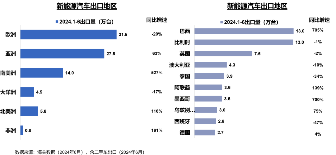 全球新能源汽车市场的持续发展正推动中国新能源汽车出口格局的转变。南美洲,尤其是巴西和墨西哥,正在迅速成为中国新能源汽车的新出口热点,需求增长迅猛,市场潜力巨大。此外,中国新能源汽车的出口正向多个区域拓展,特别是在中东、中亚和非洲等新兴市场,出口量显著增加。这一多元化的市场战略不仅展示了中国新能源汽车的市场多样性,也证明了其在全球市场上的竞争力和影响力正在不断增强。尽管对非洲的出口量目前相对较小,但高达161%的增长率预示着中国新能源汽车在该地区的巨大潜力(如图二所示)